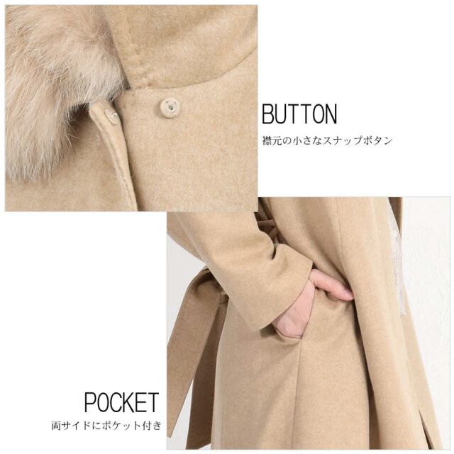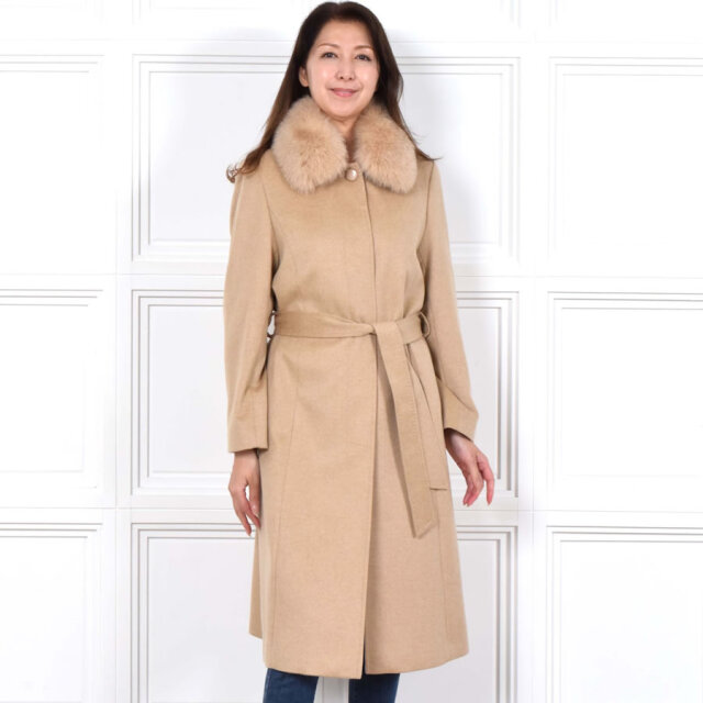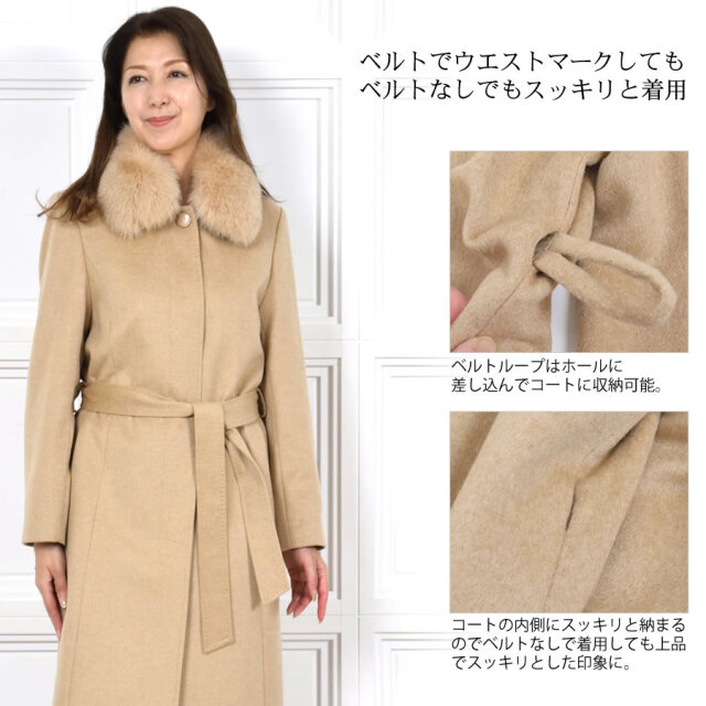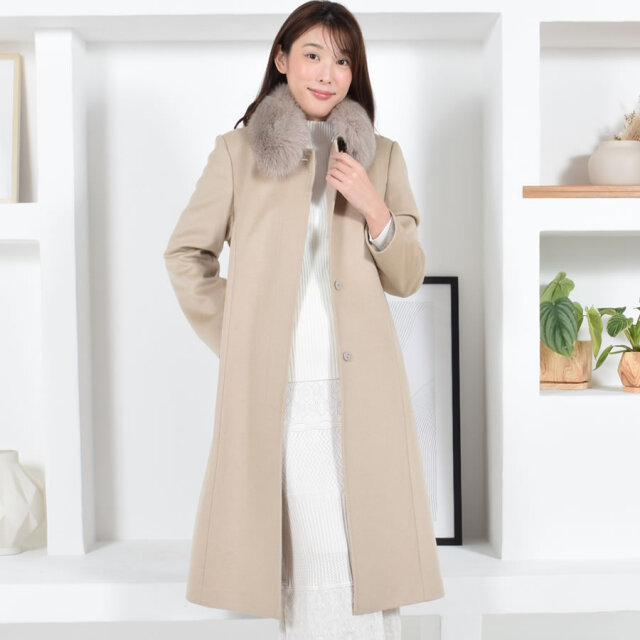 「繊維の宝石」と呼ばれるカシミヤ。上質な素材が放つ艶感は、やはり格別。着心地もラグジュアリー感も本物を知る大人の女性のための洗練されたカシミヤ100%コート。カシミヤ100%は上品な美しさや高級感もさることながら、繊維の細かさ、柔らかさ風合いの良さ、軽さ、そして優れた保温性などをあわせもった素材です。フォックスファーは毛足の長さと滑らかな肌触りが特徴。ボリュームがあるのでとても華やかで存在感があります。ベルトを締めることで縦長効果も◎ファーを取外すとすっきりとしたステンカラーコートに。通勤スタイルや普段使い、フォーマルスタイルなどコーディネートの幅が広がります。