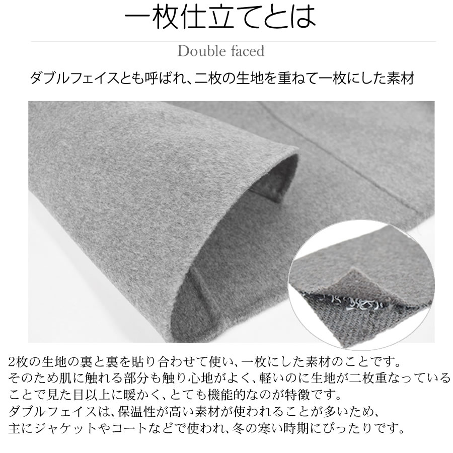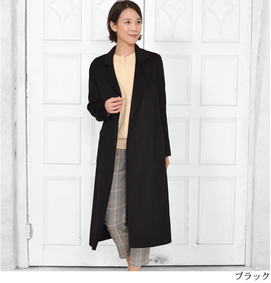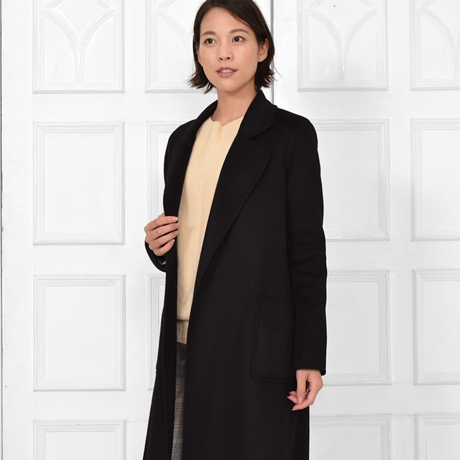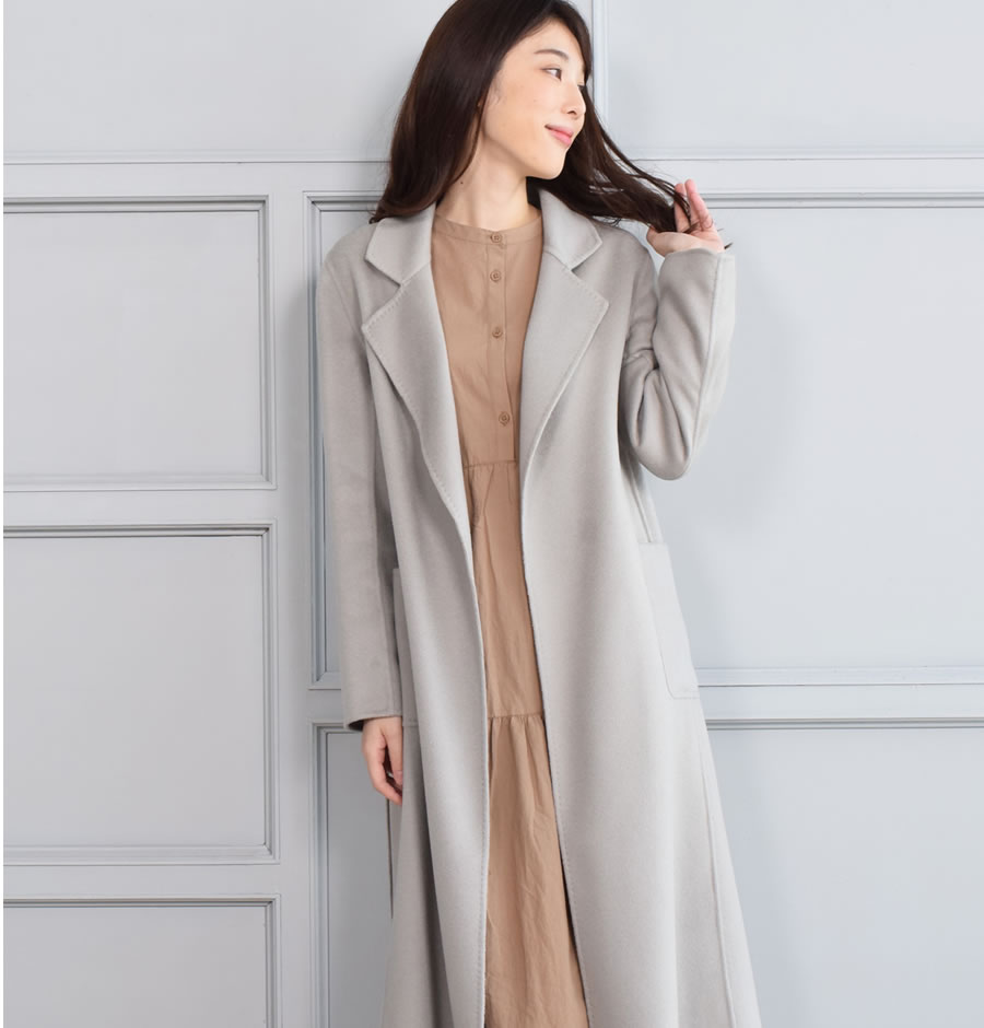 極上のカシミヤ生地と丁寧なて仕事から生まれた、美しく上質なダブルフェイスコート。柔らかで滑らかな肌触りと光沢、生地を2枚重ねたダブルフェイスで肩のこらないしなやかな軽さと空気を多く含み暖かさを実現した、上品でエレガントな優しさを印象づける一着です。ボタンレスのガウン風のデザインでさっと羽織るだけでカッコよく決まり、共生地ベルトでウエストマークするときちんと感が出て装いが引き締まります。