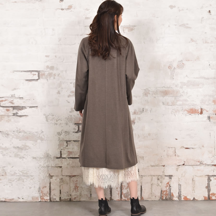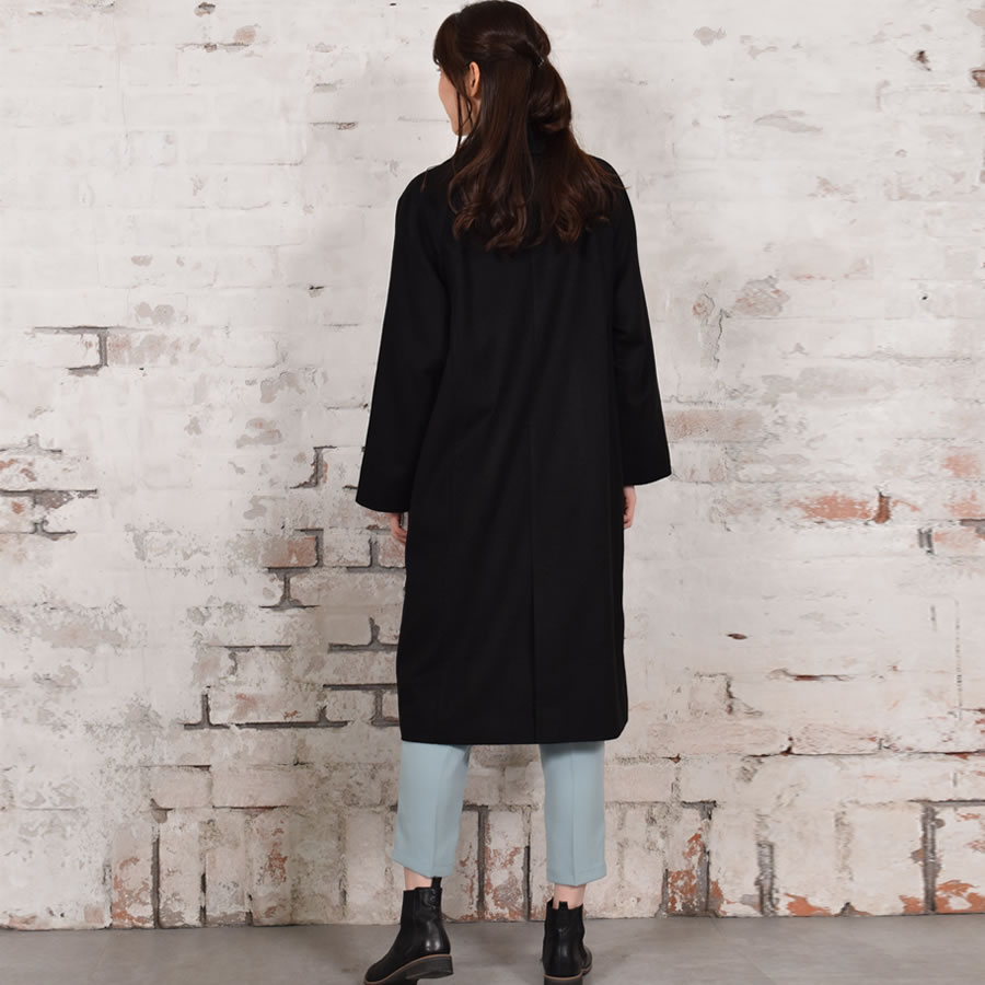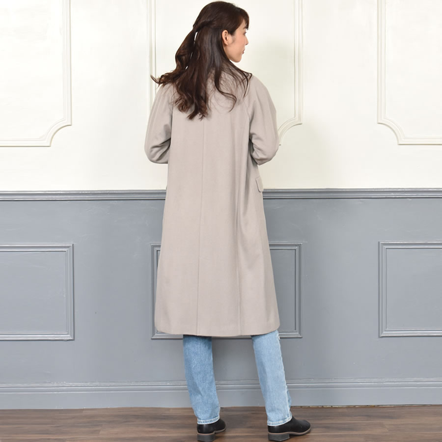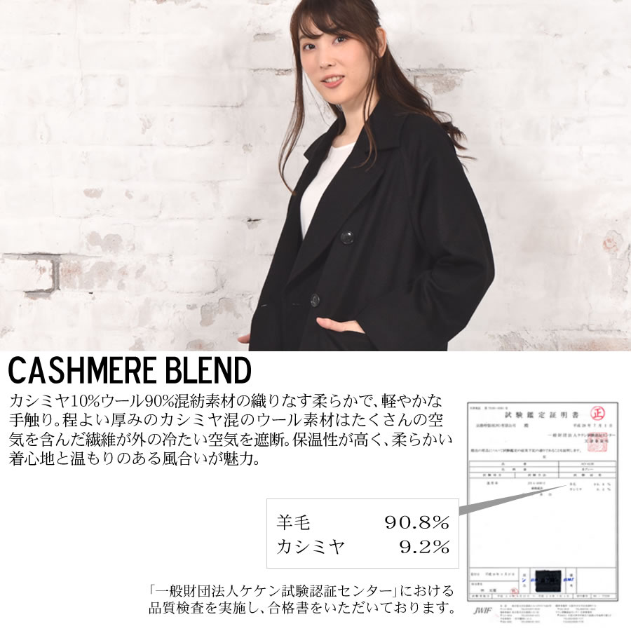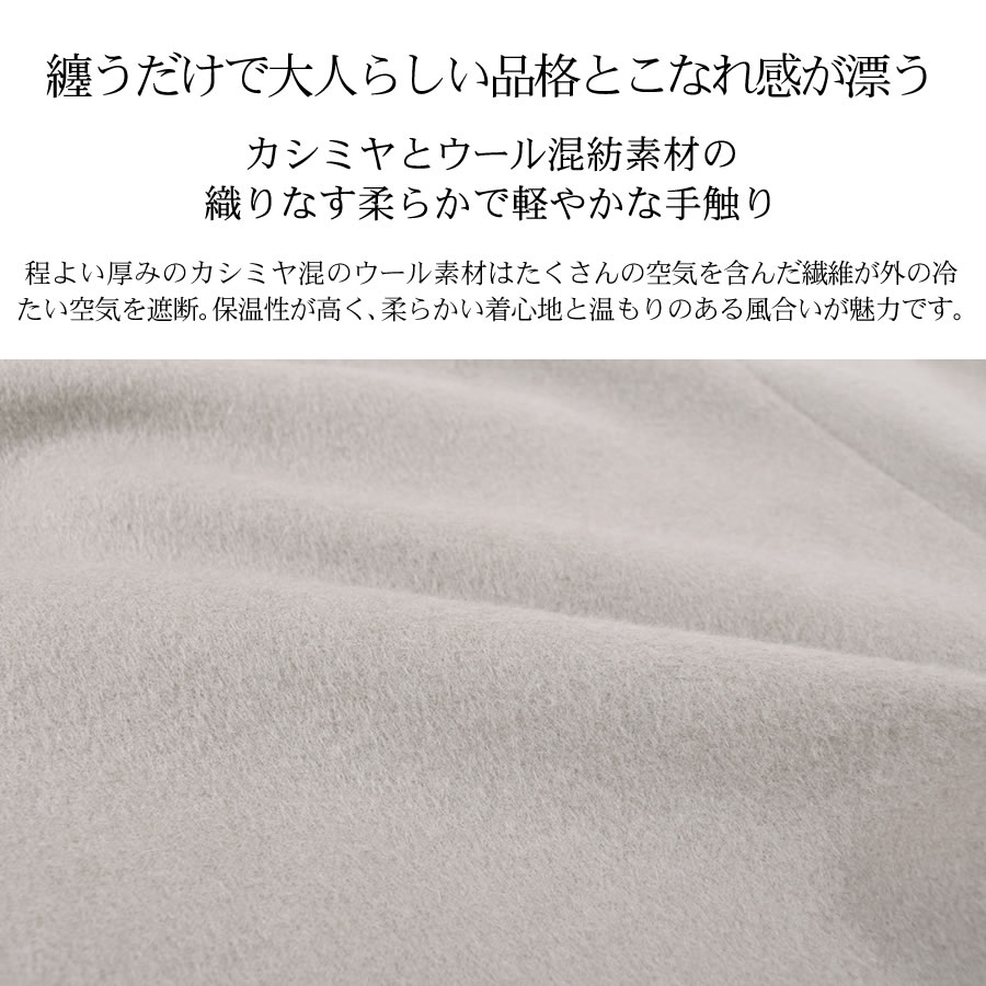 ボックスシルエットが旬なダブルチェスターコートです。カシミヤ10%ウール90%混紡素材の織りなす生地は、柔らかく軽やか。肌触りが良く、ソフトな着心地で高級感があります。ラグランスリーブを採用し、大人っぽいシックなデザイン。存在感のある大きめの襟が首元をスッキリと女性らしく見せ、小顔効果も◎。スカート裾をチラ見せできる上品な膝下丈でオフィスコーデにも最適です。シンプルなデザインのため、オン・オフ問わず着まわせる汎用性の高いアイテムです。