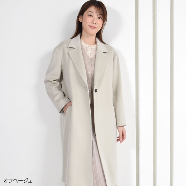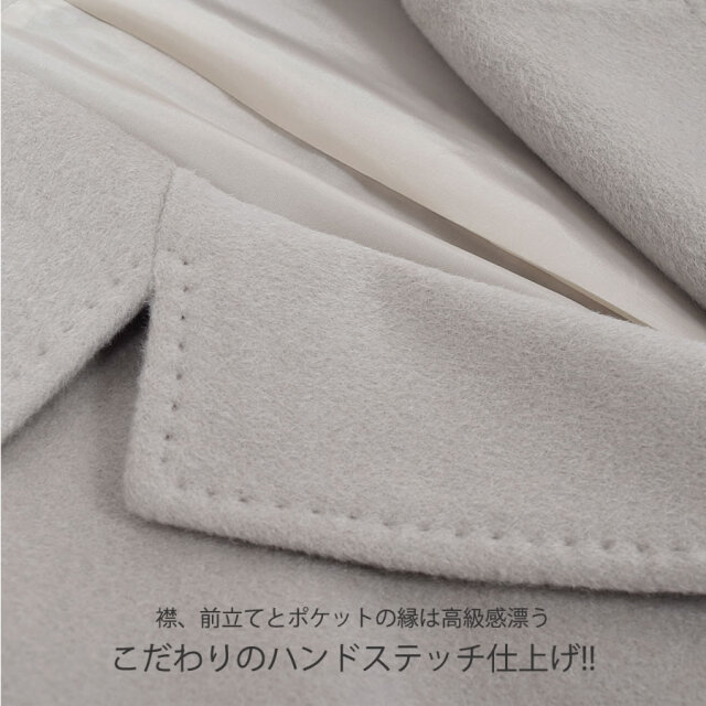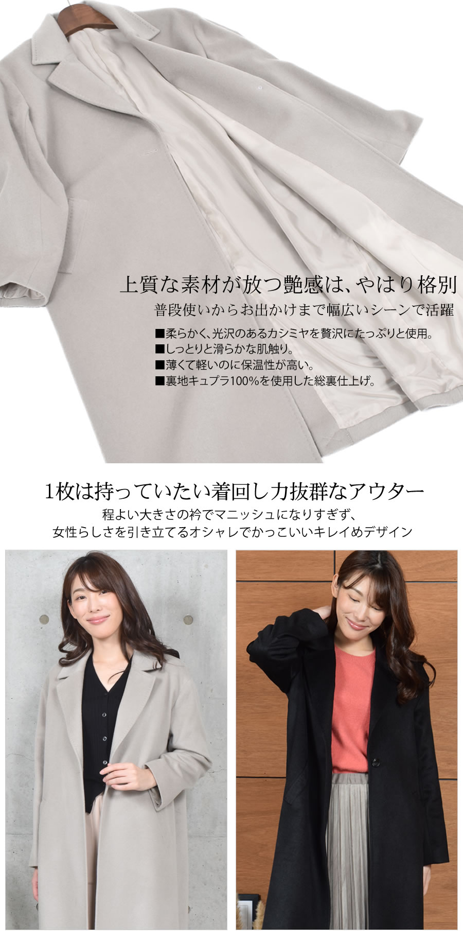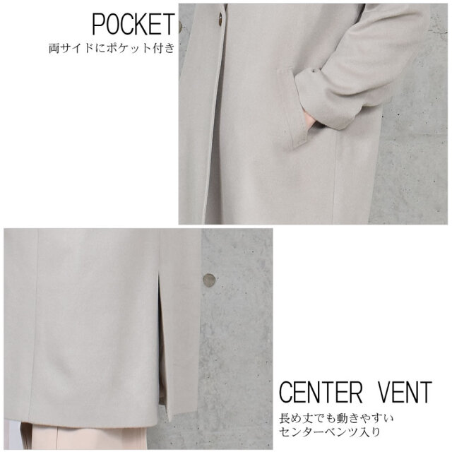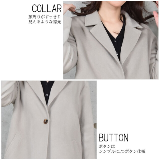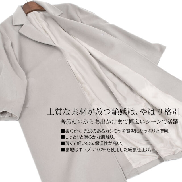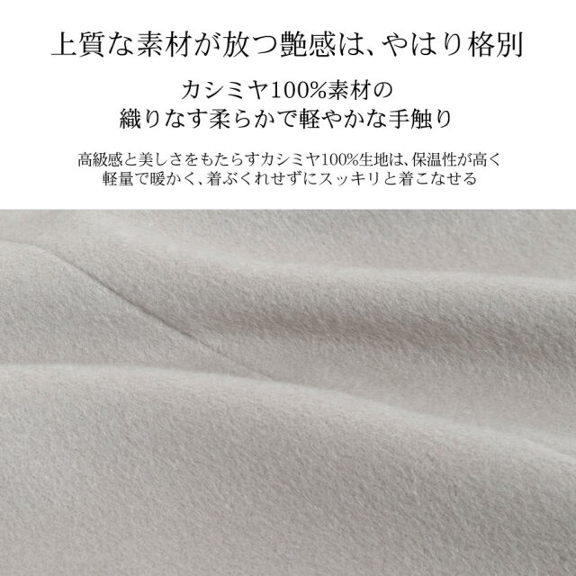 カシミヤ100%は上品な美しさや高級感もさることながら、繊維の細かさ、柔らかさ風合いの良さ、軽さ、そして優れた保温性などをあわせもった素材です。サラッと羽織るだけで大人の女性らしさを引き立てるすっきりシルエット。程よい大きさの衿でマニッシュになりすぎず、きれいめに着用できます。ややドロップショルダーのデザインで、厚手のインナーを合わせてもゆとりのある肩周り。エレガントなスタイルやデニムと合わせてカジュアルスタイルと幅広いコーデに合わせることができる良質な素材感が際立つ上品なコートです。