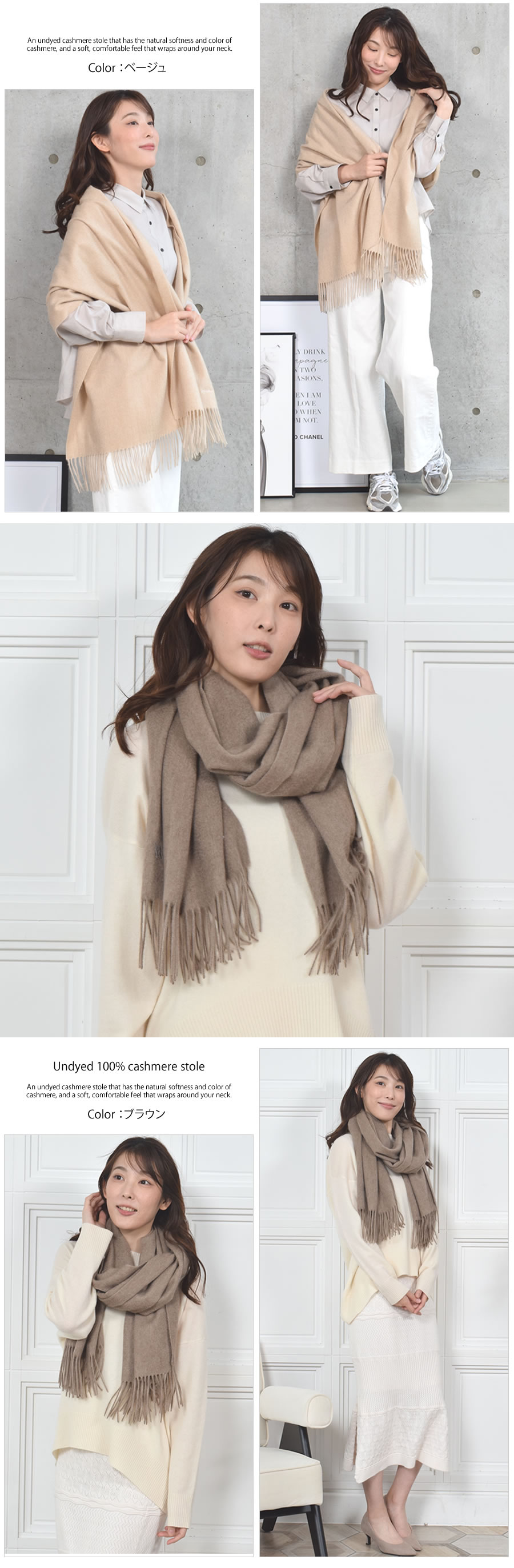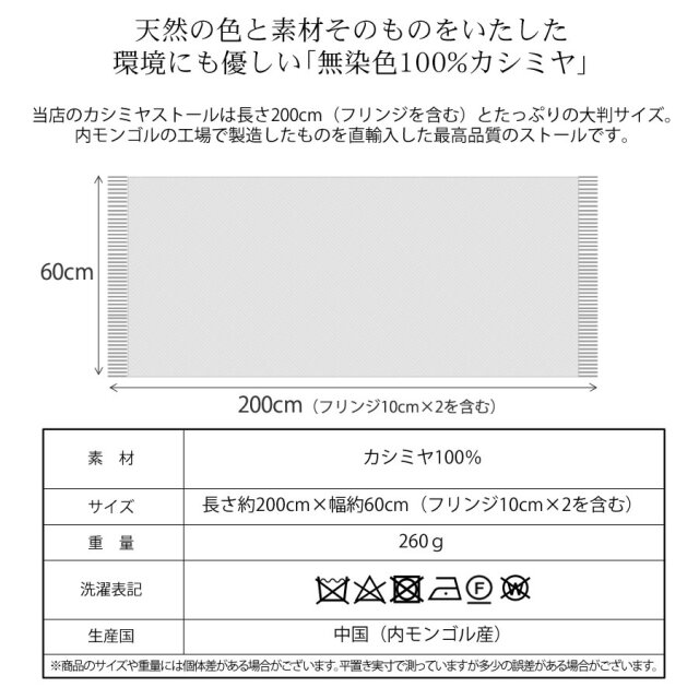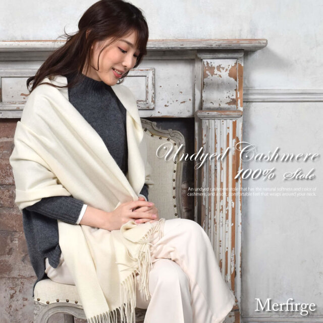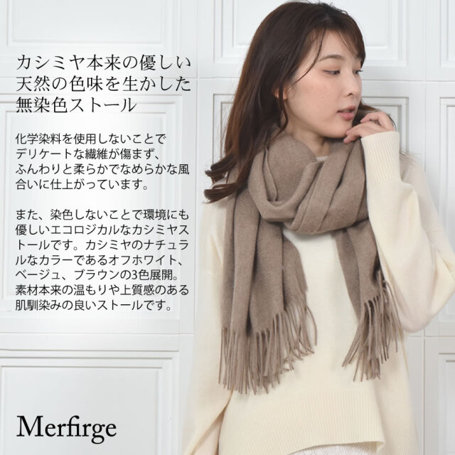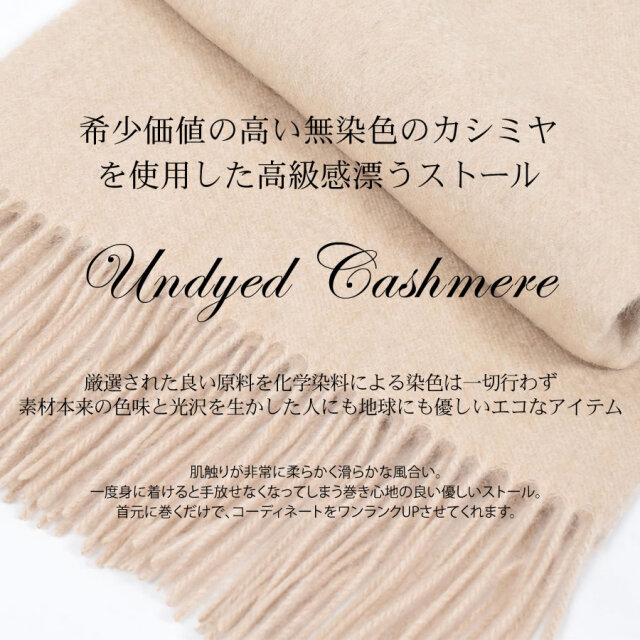 カシミヤ本来の優しい天然の色味を生かした無染色ストール。化学染料を使用しないことでデリケートな繊維が傷まず、ふんわりと柔らかでなめらかな風合いに仕上がっています。また、染色しないことで環境にも優しいエコロジカルなカシミヤストール。カシミヤのナチュラルなカラーであるオフホワイト、ベージュ、ブラウンの3色展開。素材本来の温もりや上質感のある肌馴染みの良いストールです。
