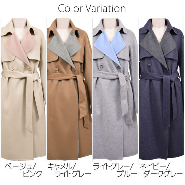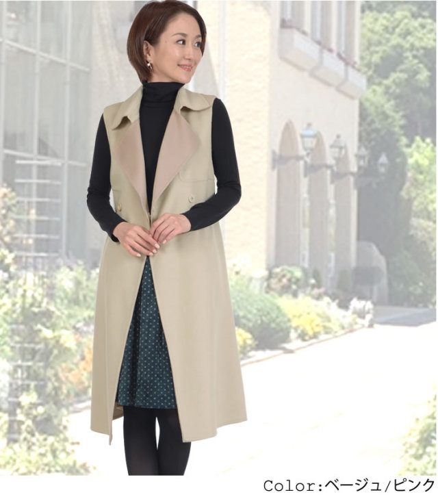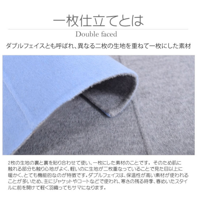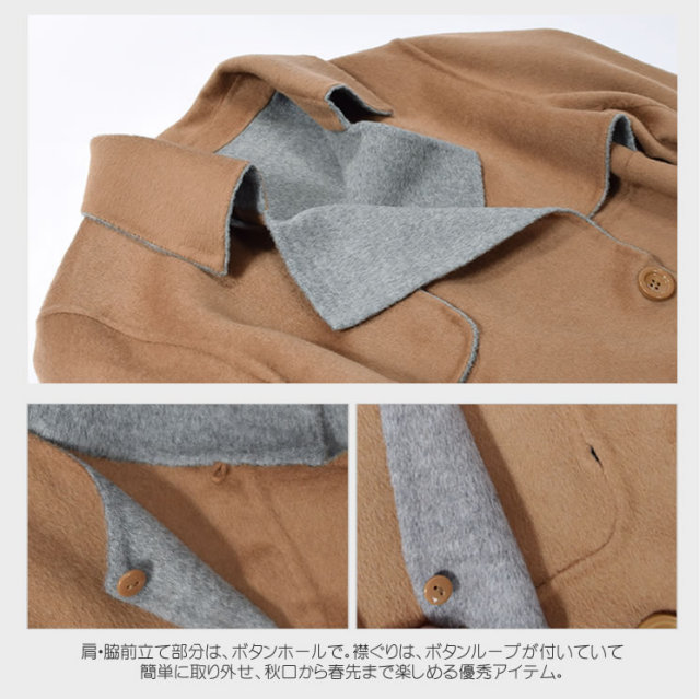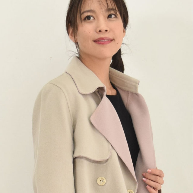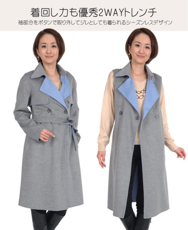カシミヤ10%アンゴラ20%ウール70%混紡のダブルフェイスコートは、軽やかな質感と高級感が漂う。王道のトレンチコートとみせておきながら、肩章から袖を取り外すと今年トレンドのジレにチェンジ。極上の柔らかさと今までにない軽さでラクな着心地のキレイめアイテム。2Wayトレンチでマンネリにならない着こなしを叶える。袖部分をボタンで取り外して簡単にジレとしても着られるシーズンレスデザイン。着心地もラグジュアリー感も本物を知る大人の女性のための洗練されたカシミヤ混紡のダブルフェイスコート。初秋や春先にはジレで、肌寒い季節にはトレンチコートで、おしゃれの先取りを意識した新しい発想の薄軽コートです。
