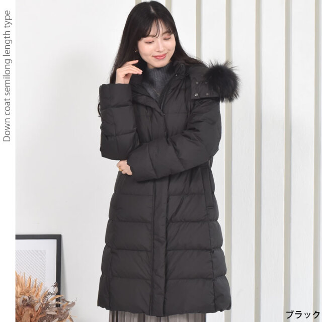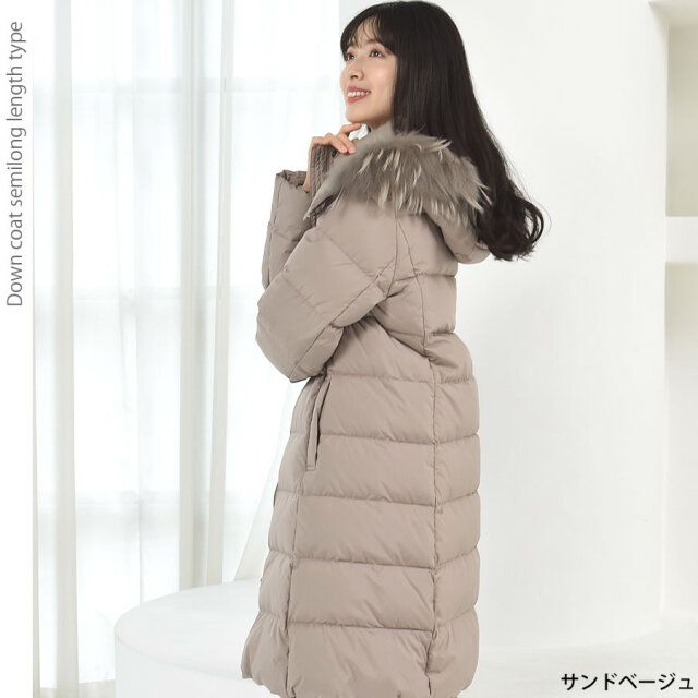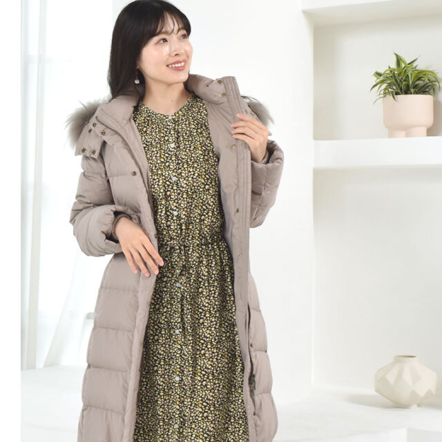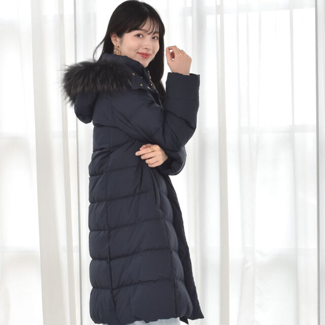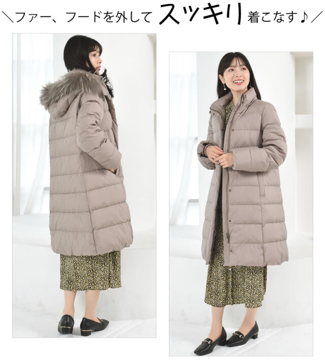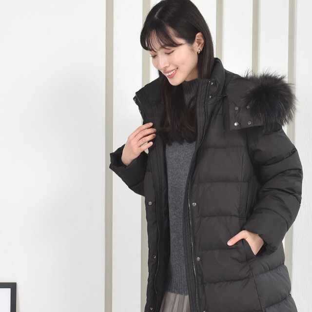 スッキリ細見えするダウンコート。軽くてソフトで暖かな着心地のコートは、たっぷりダウン90%使用。艶やかな本物のラクーンファーでお顔周りも暖かい。コクーンデザインで女性らしさと上品で美しいシルエットを実現。フードを取り外した後もファスナーが隠れる仕様でスッキリとスタンド襟で着ることができます。袖口には、リブ内蔵で防寒対策も◎弱撥水加工を施し、急な雨や雪などの時にも安心。カジュアルにも通勤にも着回せる万能なダウンコートです。