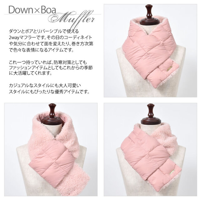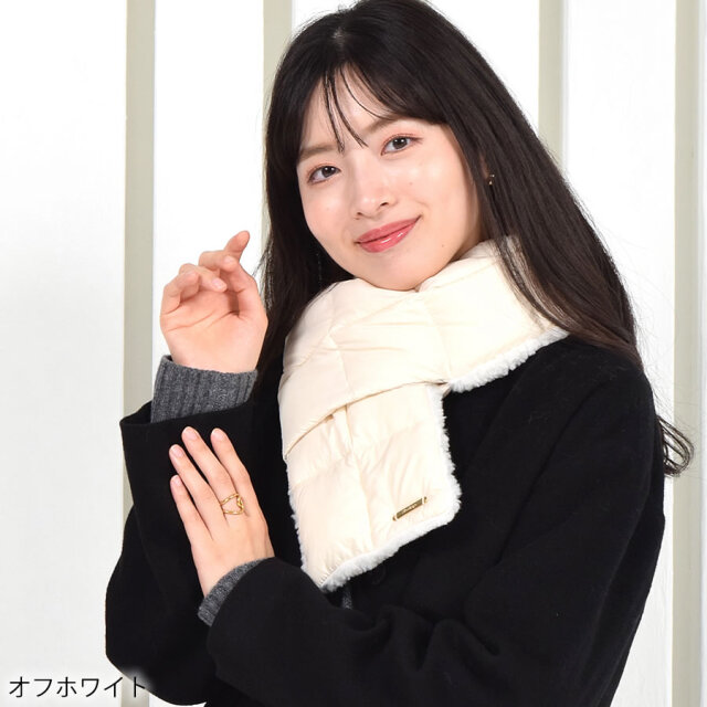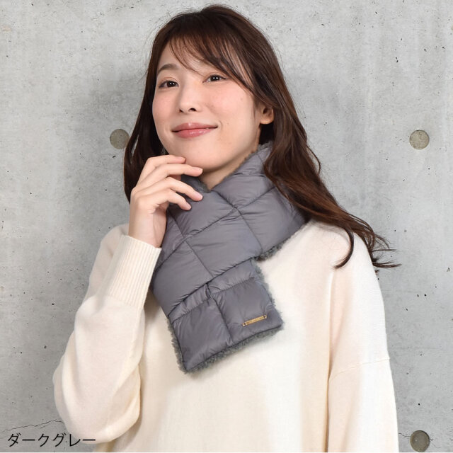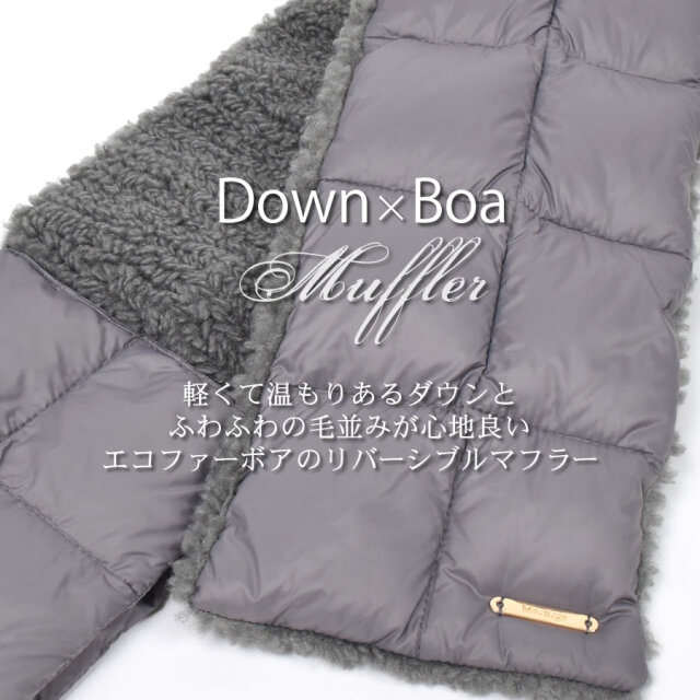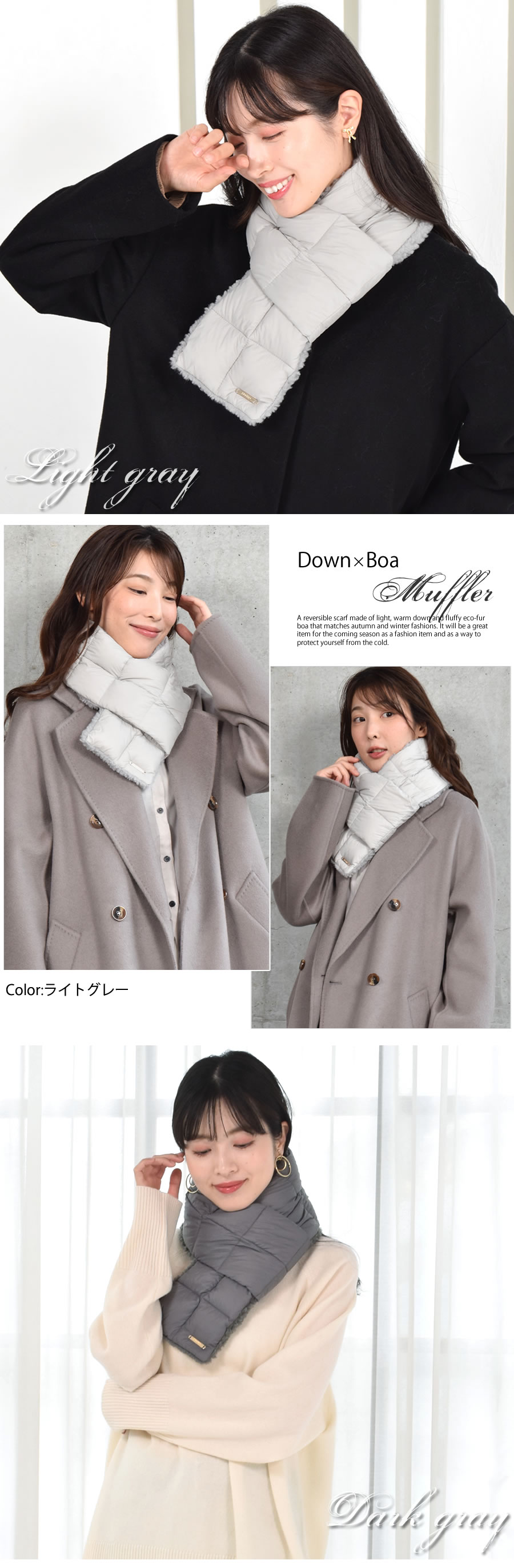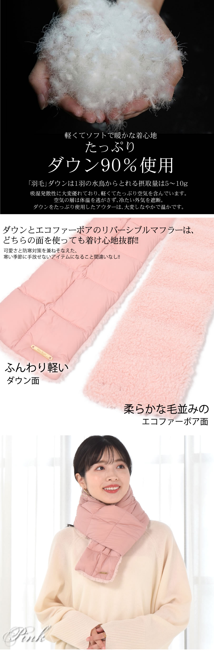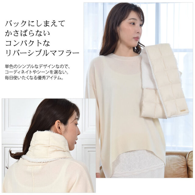 ダウンの軽さ、エコファーボアのふわふわな毛並みが心地良く暖かいリバーシブルマフラー。コンパクトで軽くて暖かいマフラーは、寒い季節にもファッションアイテムでも大活躍してくれる優れモノ。ベーシックなデザインと使えるカラーで防寒対策としてもファッションアイテムとしてもこれからの季節に大活躍。両面使いができるのでこれひとつ持っていれば、気軽にサッと巻けて便利。コーディネートやシーンを選ばず、毎日使いたいと思える優秀アイテムです。