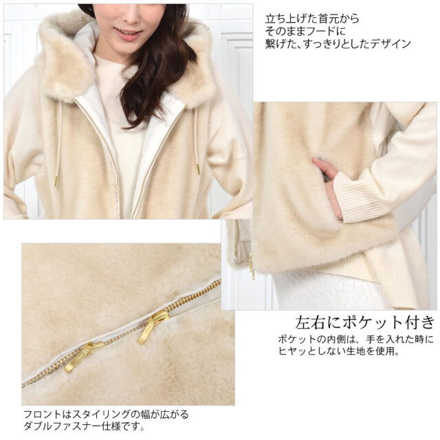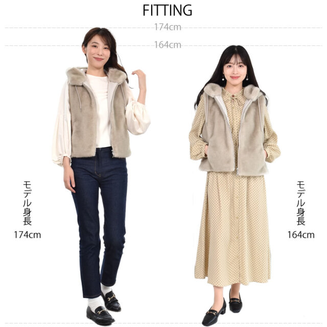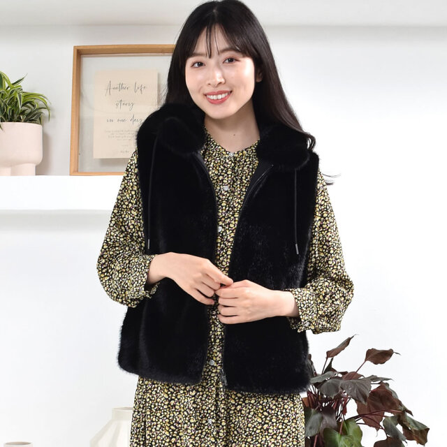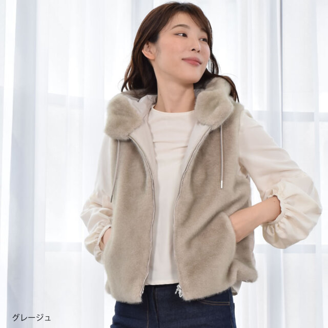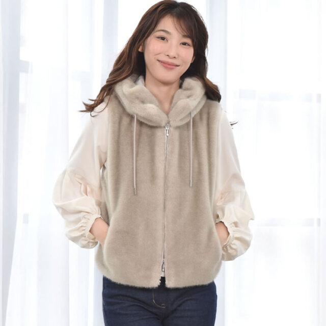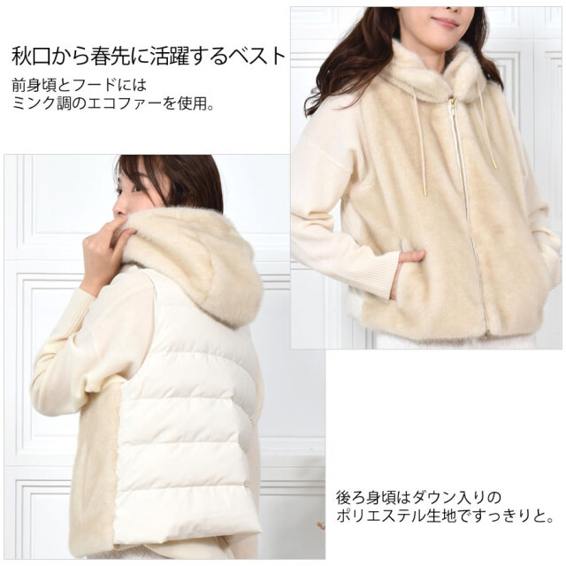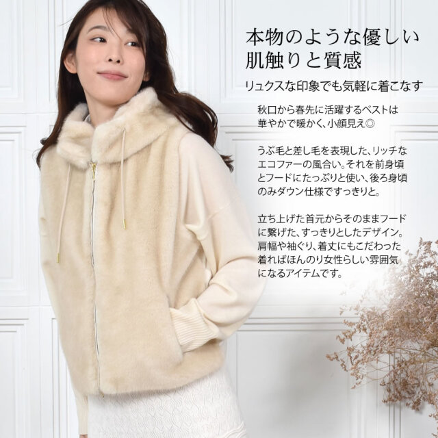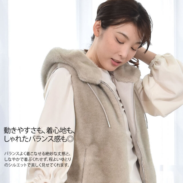 秋口から春先に活躍するベストは華やかで暖かく、小顔見え◎前身頃はミンク調のエコファー、後ろ身頃はダウン入りのポリエステル生地ですっきりと。近年の気候変動でますます活躍期間が長くなっているのがダウンベスト。スリーブレスなので、インに合わせるアイテム次第で着回しと温度調節が思いのまま。若々しく颯爽としたイメージを与えてくれるダウンベストの暖かさはキープしつつ、エコファー仕立てでアップグレード。程よいゆとりのシルエット、吟味したダウン量で、もちろん着ぶくれ感とは無縁です。立ち上げた首元からそのままフードに繋げた、すっきりとしたデザインでフロントはスタイリングの幅が広がるダブルファスナー仕様です。肩幅や袖ぐり、着丈にもこだわった着ればほんのり女性らしい雰囲気になるアイテムです。