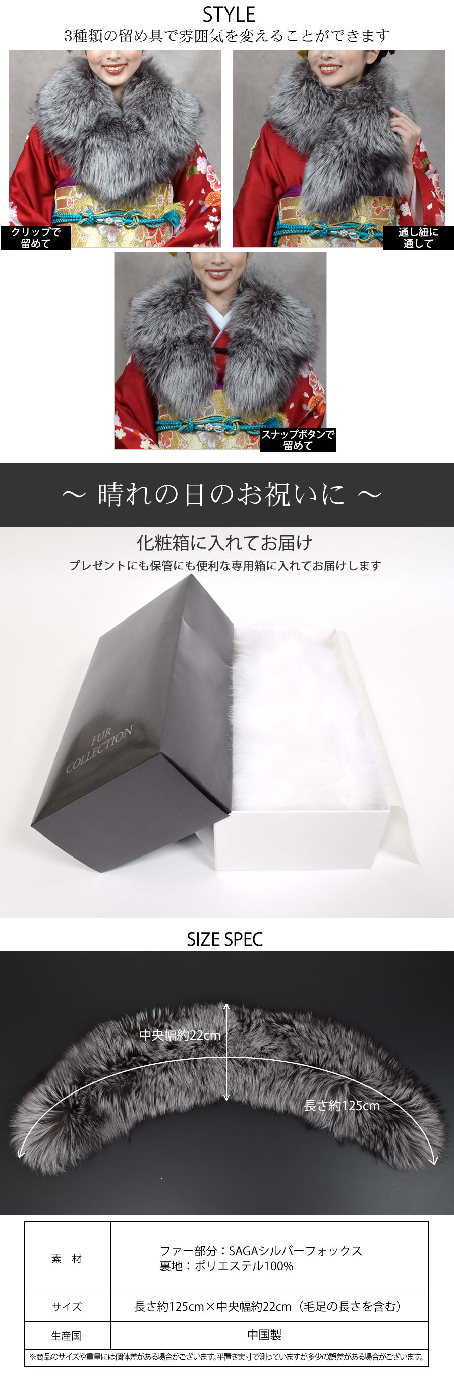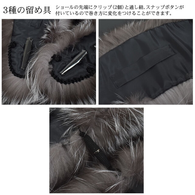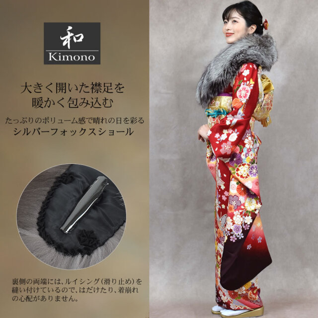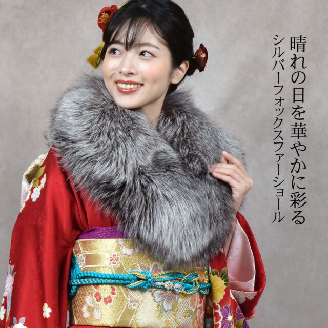 北欧の由緒あるSAGAのシルバーフォックスを使用。艶やかで毛並みの良いサラッとした上質な感触と高級感溢れる大きめのファーカラー。成人式・結婚式・パーティーはもちろん、お手持ちのコートに合わせれば、ゴージャスなボリューム感で華やかさを添え、ラグジュアリーな印象に。天然ならではのコントラストが美しく、その光沢が放つ気品は晴れの日の装いを華やかに彩ります。