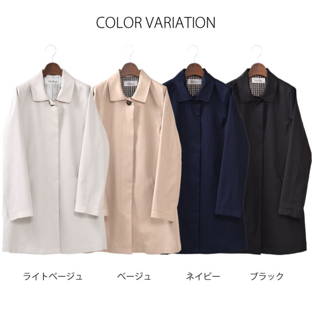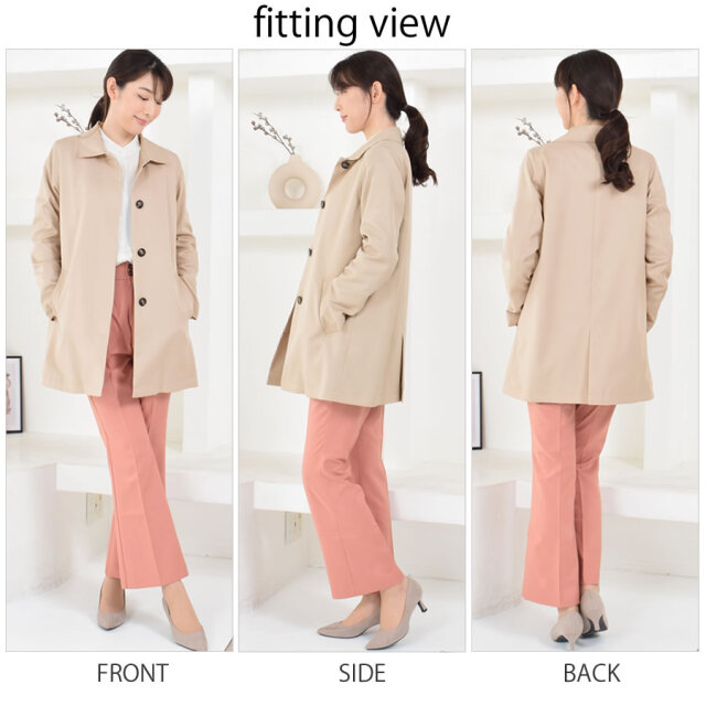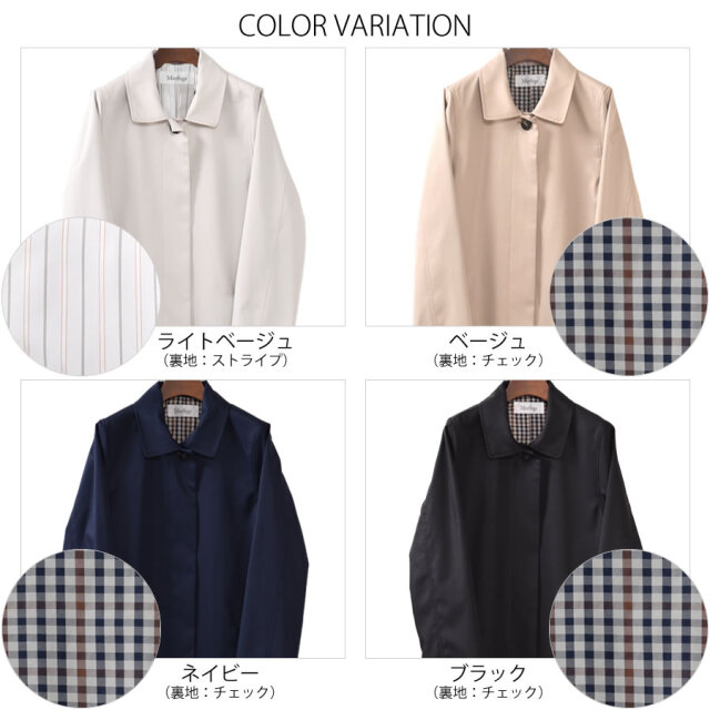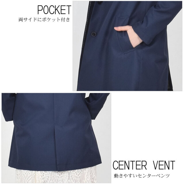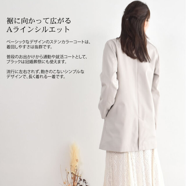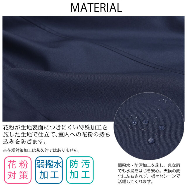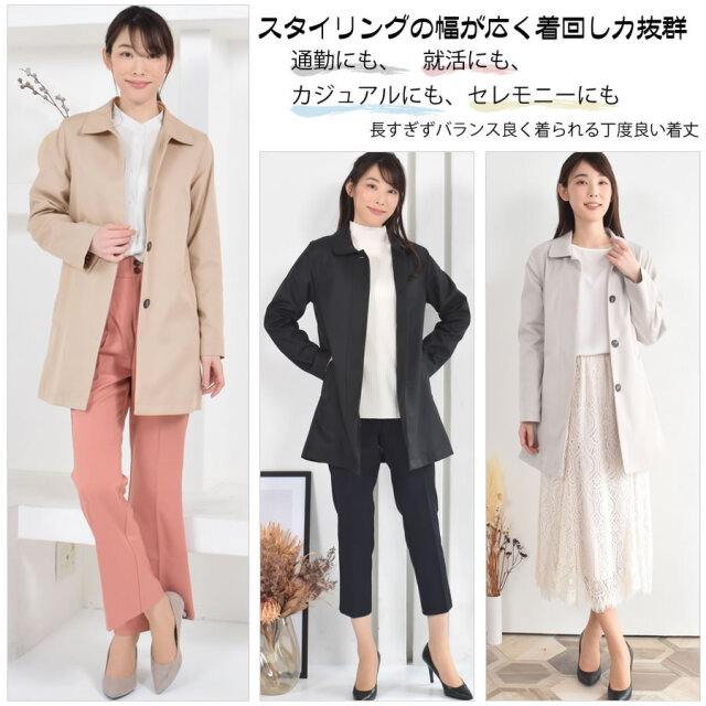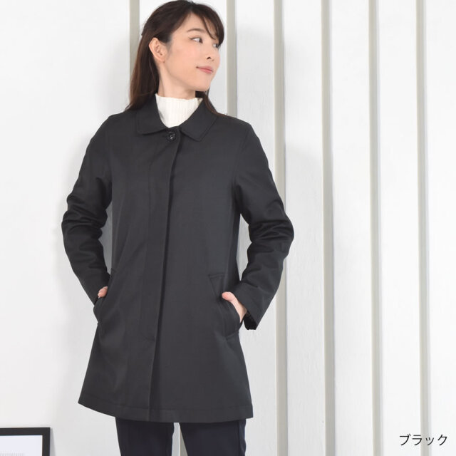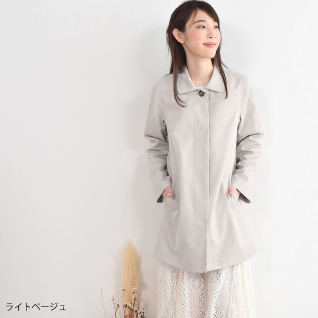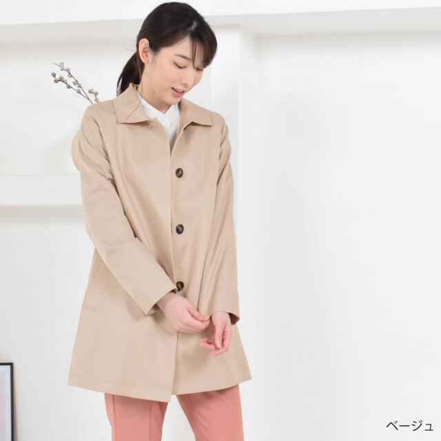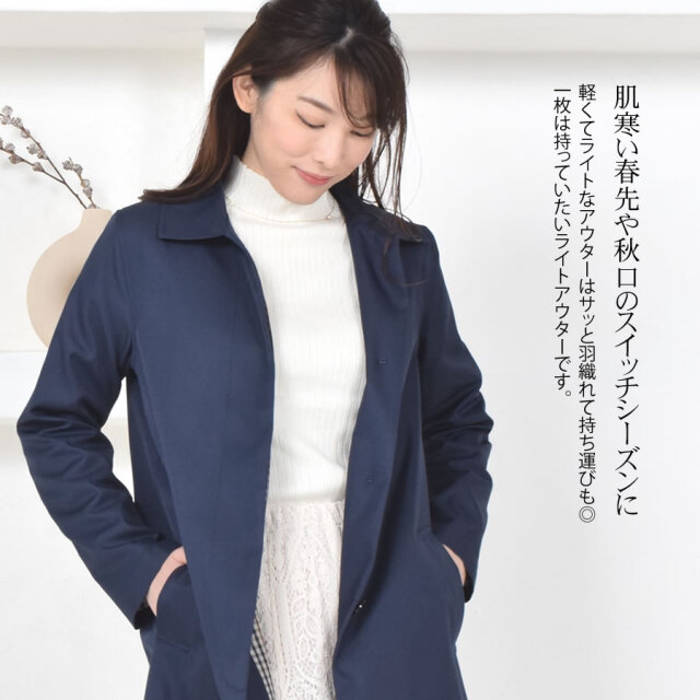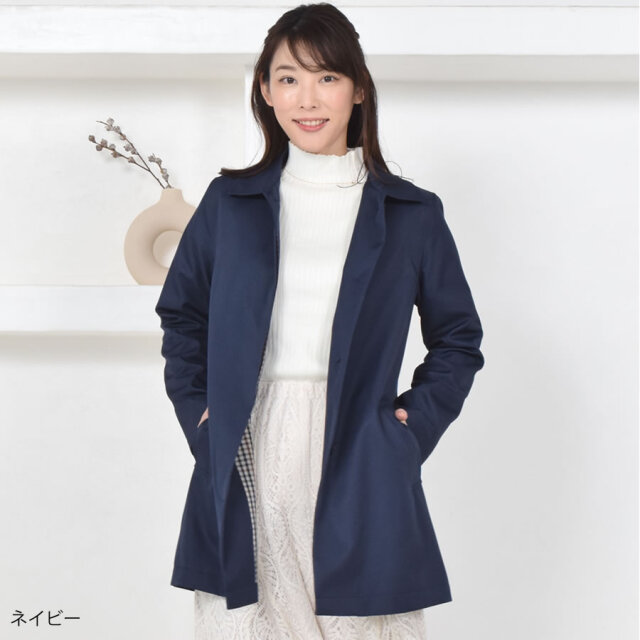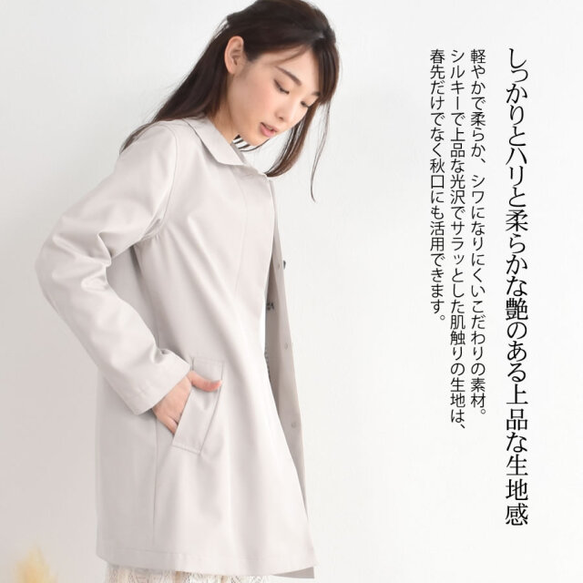 シンプルなデザインのステンカラーコート。シワになりにくく、微光沢感がプラスされた上品な印象に仕上げられ、きちんと感もあるのでどんな装いにも合わせやすいシルエットに仕上げています。裏地にはおしゃれなチェック柄を採用。すっきりとシンプルなAラインで日常からビジネスまで上品に着こなすことができます。春先から秋まで長い時期で活躍してくれるのもうれしい!花粉付着防止加工、弱撥水加工を施された機能性も魅力的なコートです。