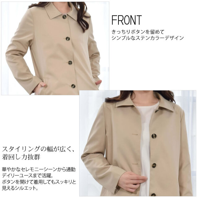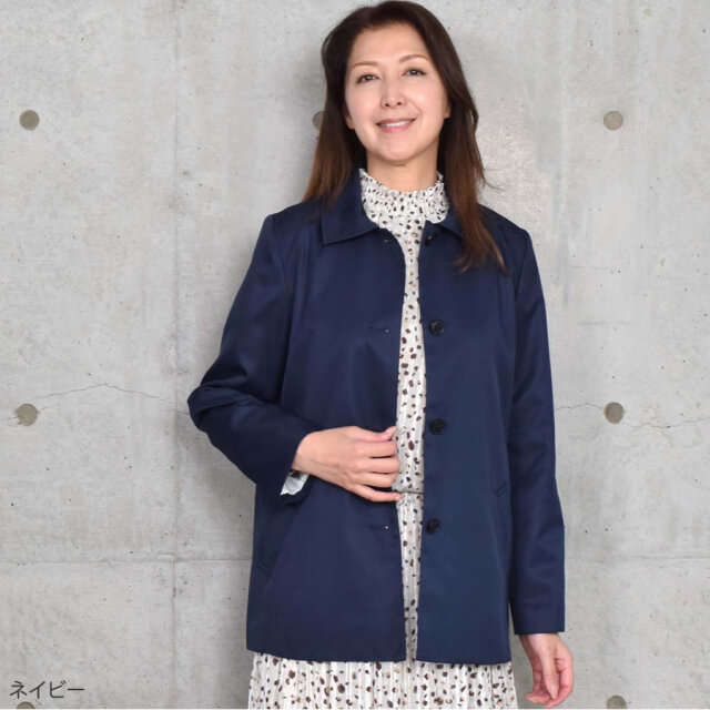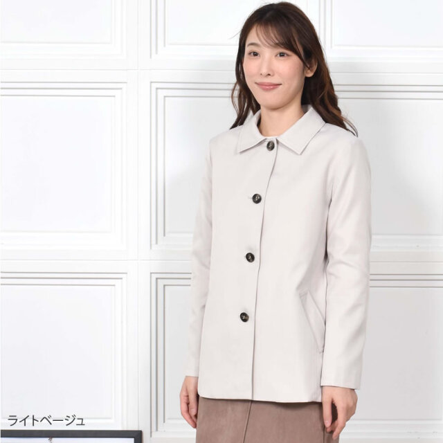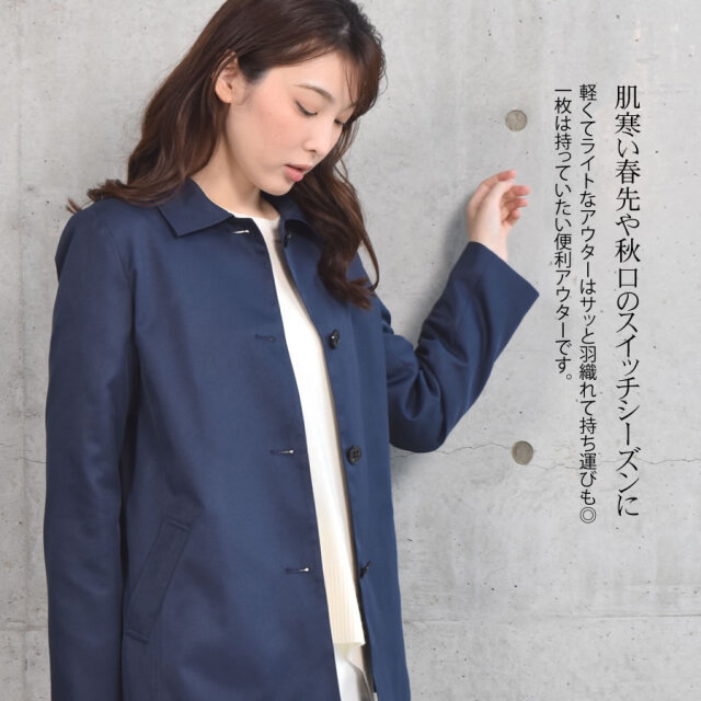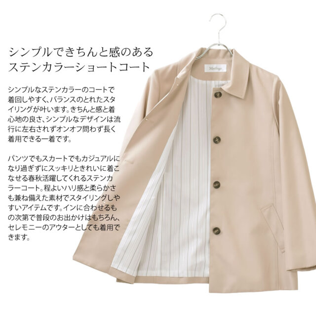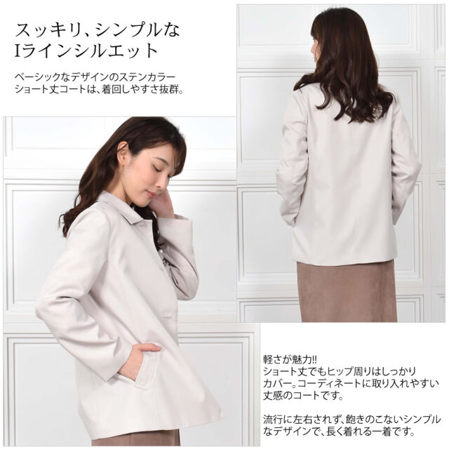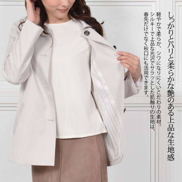 すっきりとシンプルなライン、サラッと羽織りやすい着丈に仕上げたステンカラーコートショートコート。腰回りをカバーする程よい長さとジャケットのように気軽に羽織れる軽さが魅力のアイテム。 シワになりにくく、微光沢感がプラスされた上品な印象に仕上げられ、きちんと感もあるのでどんな装いにも合わせやすいシルエットです。 スカートにもパンツにも合わせやすいショート丈コートは、春秋のワードローブに加えておきたい大人のベーシックアイテム。ラフに羽織ったり、インに何でも合わせることができます。シルキーで上品な光沢でサラッとした肌触りの生地感で スイッチシーズンに活躍してくれる定番のステンカラーコートです。