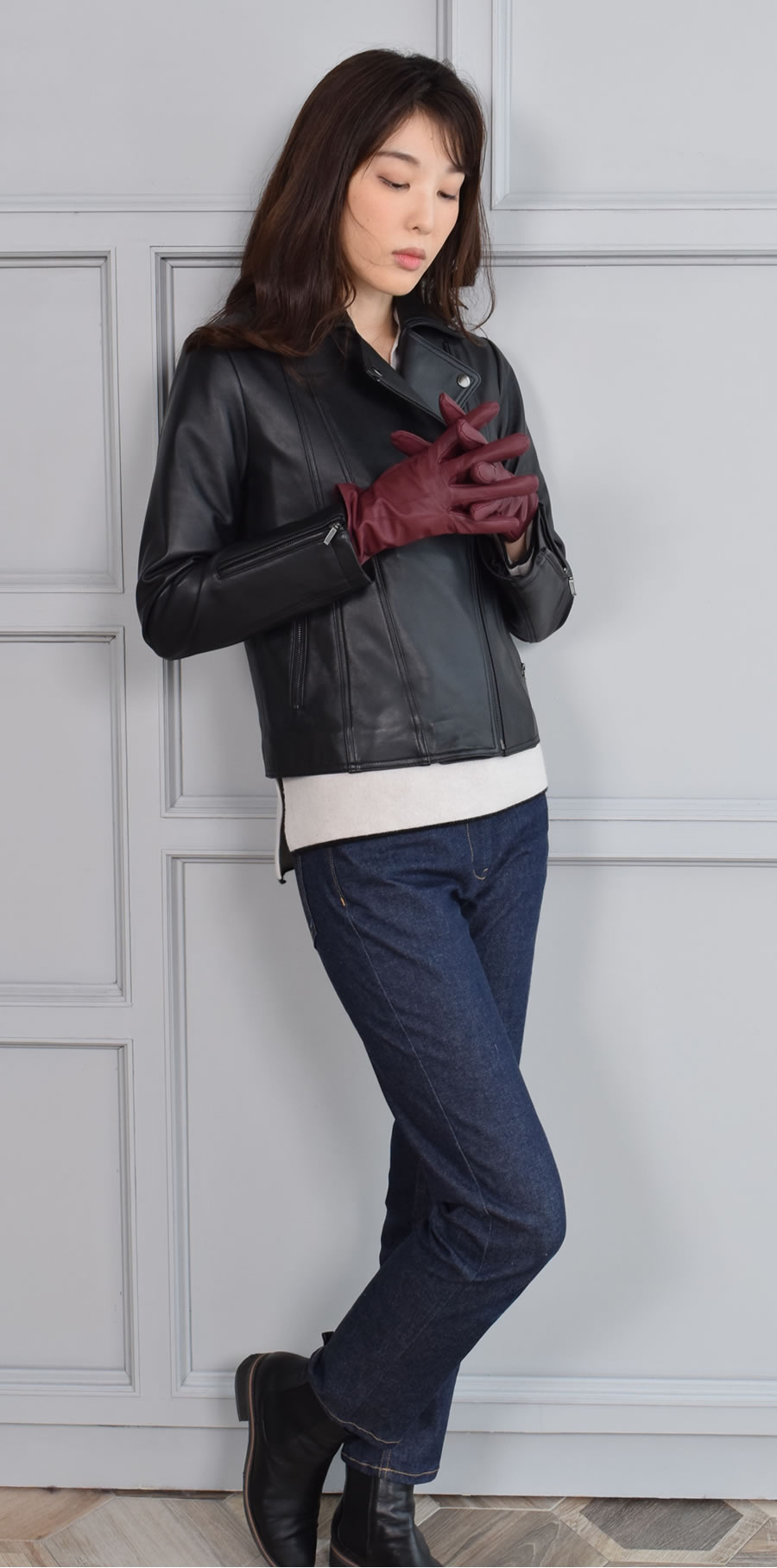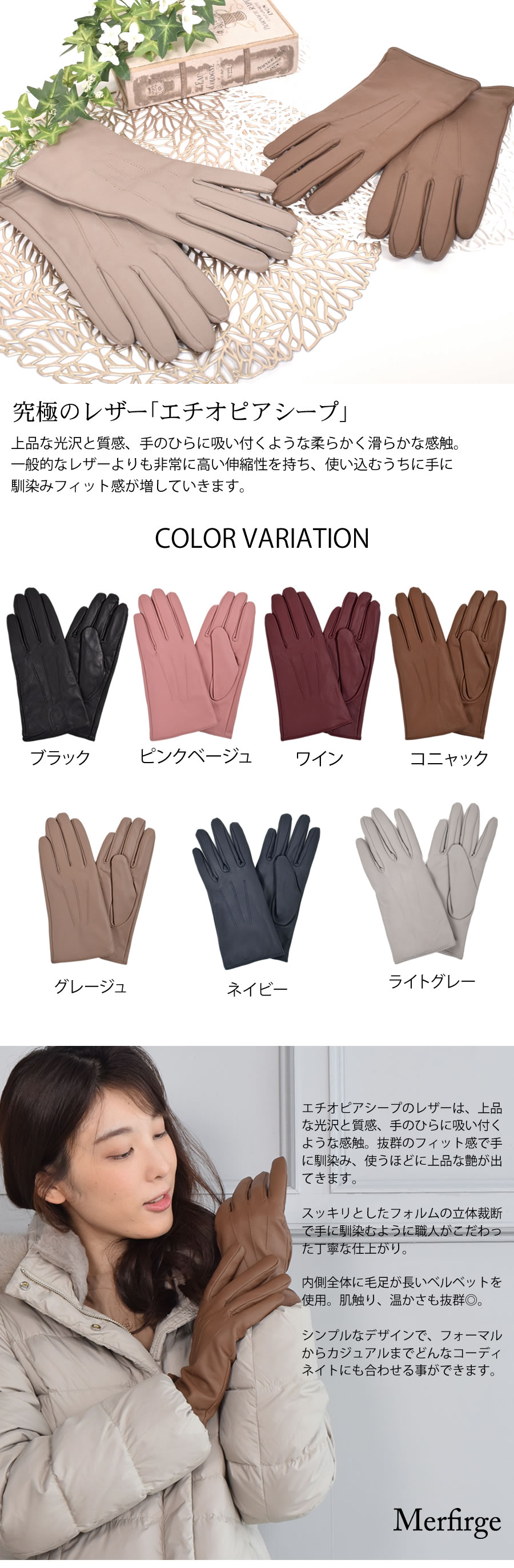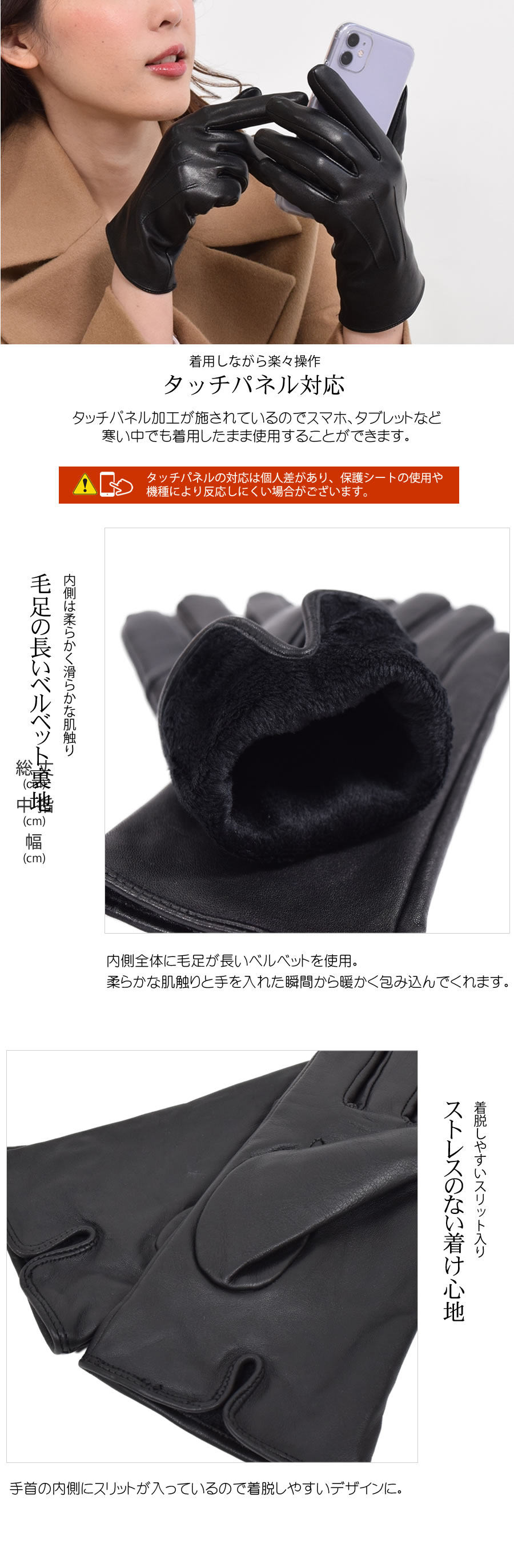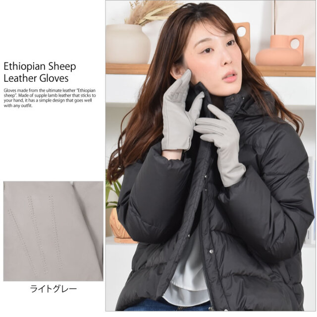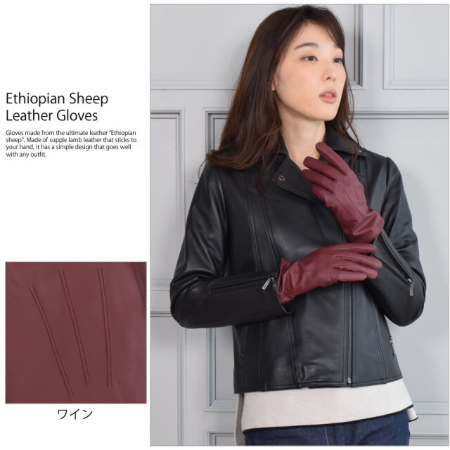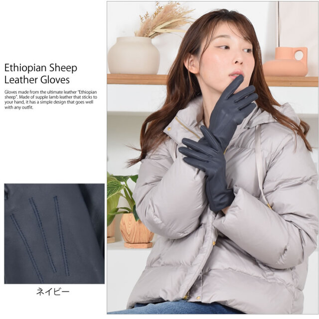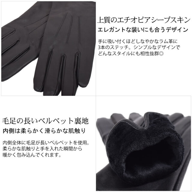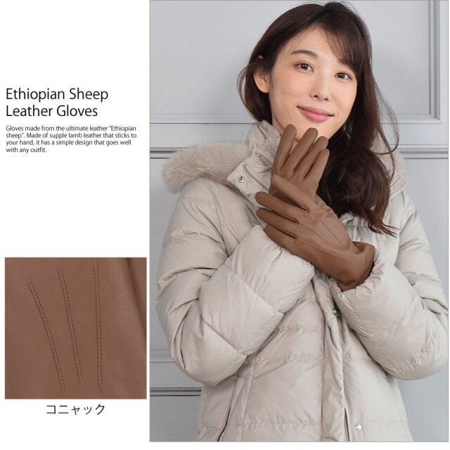 上品な光沢と質感、手のひらに吸い付くような柔らかく滑らかな感触の「エチオピアシープ」を使用した手袋。一般的なレザーよりも非常に高い伸縮性を持ち、使い込むうちに手に馴染みフィット感が増していきます。スッキリとしたフォルムの立体裁断で手に馴染むように職人がこだわった丁寧な仕上がり。内側は毛足の長いベルベット裏地で柔らかく滑らかな肌触り。タッチパネル加工が施されているのでスマホ、タブレットなど寒い中でも着用したまま使用することができます。3本のステッチで表情を出した巧みな職人技が光る、シンプルなデザインでどんな装いにも寄り添ってくれます。