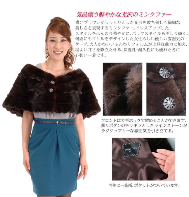 | 商品説明 | 濃いブラウンがしっとりとした光沢を放ち優しく繊細な美しさを表現するミンクファー。 |