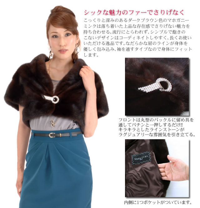 | 商品説明 | こっくりと深みのあるダークブラウン色のマホガニーミンクは落ち着いた上品な存在感で |