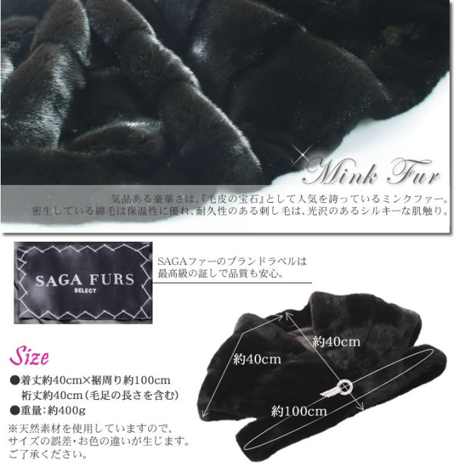 | 素材 | 毛皮:ミンク 裏地:ポリエステル100% |