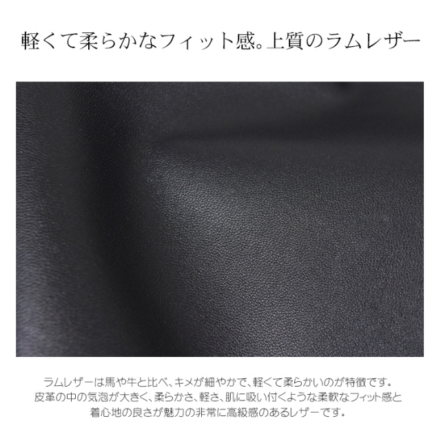 とても軽くて肌触りのよいレザージャケット。シンプルながらも小わざの利いたデザインでスタイルを選びません。 柔らかく軽い着心地で、着込むほどに味わいを増していきます。