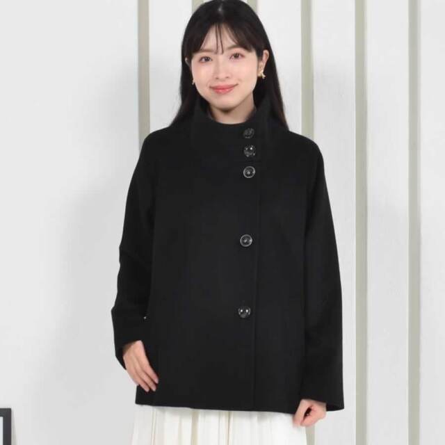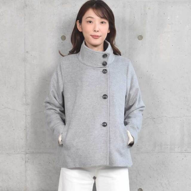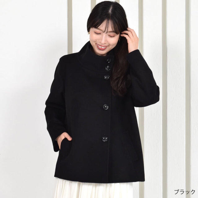 上品なウール100%素材を使用したスタンドカラーの2WAYショートコート。一番上まで留めると寒さ対策のスタンドカラーに。スタンド部分のボタンを外して衿を開けると、首周りスッキリのオープンカラーに。フロントのボタンを外して着ると衿のきざみが開けた時のアクセントになり、上品で華やいだ印象になります。また、バックスタイルはラグランスリーブなので背中にゆとりがあり、腕が動かしやすさく、前から見るとスッキリ見えするのがポイントです。しなやかで繊細なウール100%生地のコートは、寒い冬を快適に過ごすために最適なアイテムです。