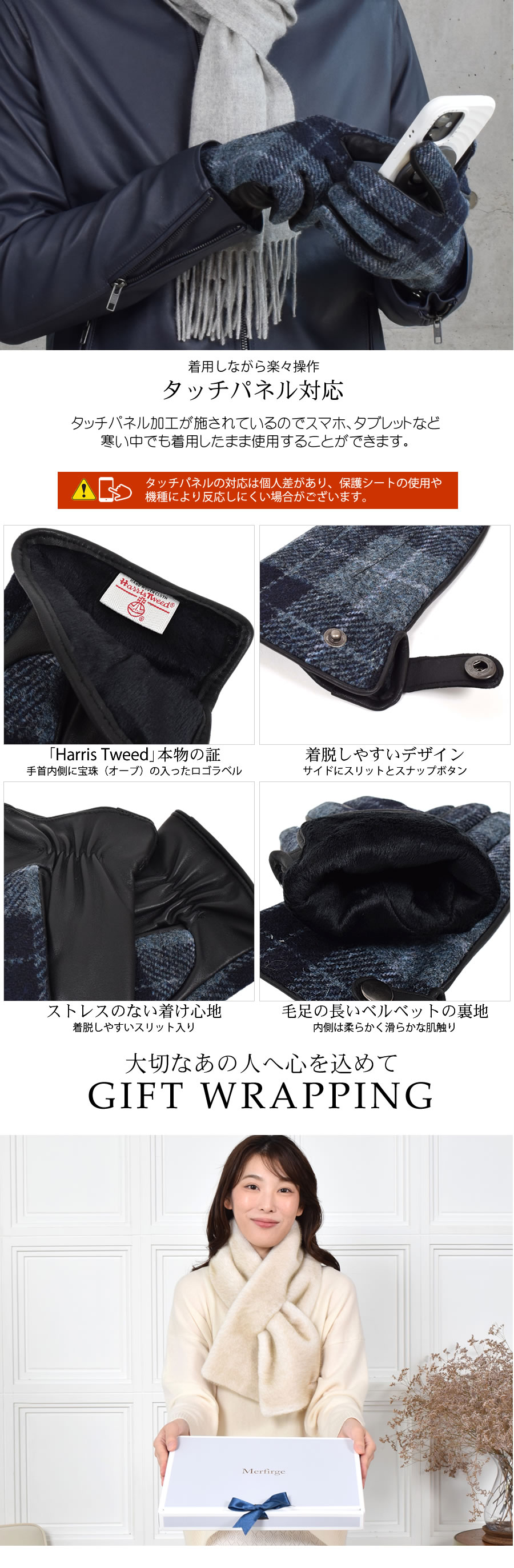 昨年人気のハリスツイードの手袋にメンズタイプが登場!!スコットランドのアウターヘイブリディーズ諸島のハリス地方で伝統職人の手によって織られたツイード生地を使用した手袋。スッキリとしたフォルムの立体裁断で手に馴染むように職人がこだわった丁寧な仕上がり。手のひら側には軽くて柔らかなフィット感の上質のラムスキンを使用。内側は毛足の長いベルベット裏地で柔らかく滑らかな肌触り。手のひらのレザー側には全面タッチパネル加工が施されているのでスマホ、タブレットなど寒い中でも着用したまま使用することができます。通勤通学から休日のカジュアルスタイルにも合わせやすいデザインです。