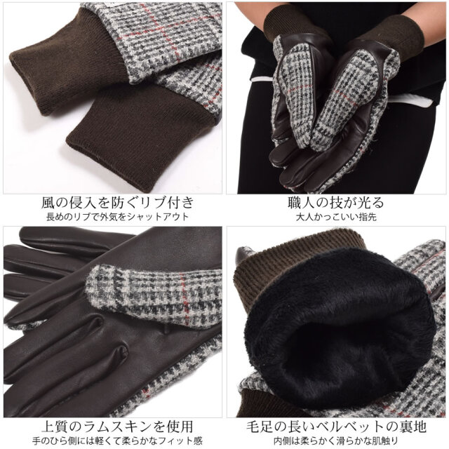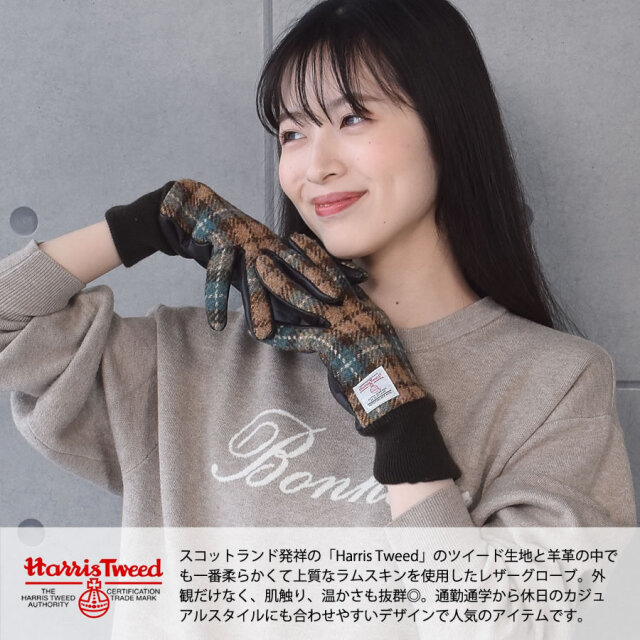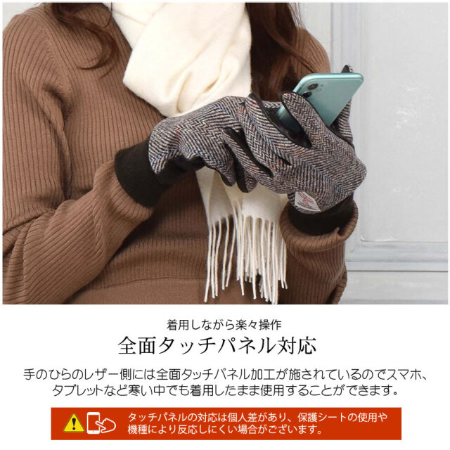 スコットランドのアウターヘイブリディーズ諸島のハリス地方で伝統職人の手によって織られたツイード生地を使用した手袋。スッキリとしたフォルムの立体裁断で手に馴染むように職人がこだわった丁寧な仕上がり。手のひら側には軽くて柔らかなフィット感の上質のラムスキンを使用。内側は毛足の長いベルベット裏地で柔らかく滑らかな肌触り。手のひらのレザー側には全面タッチパネル加工が施されているのでスマホ、タブレットなど寒い中でも着用したまま使用することができます。通勤通学から休日のカジュアルスタイルにも合わせやすい人気のアイテムです。