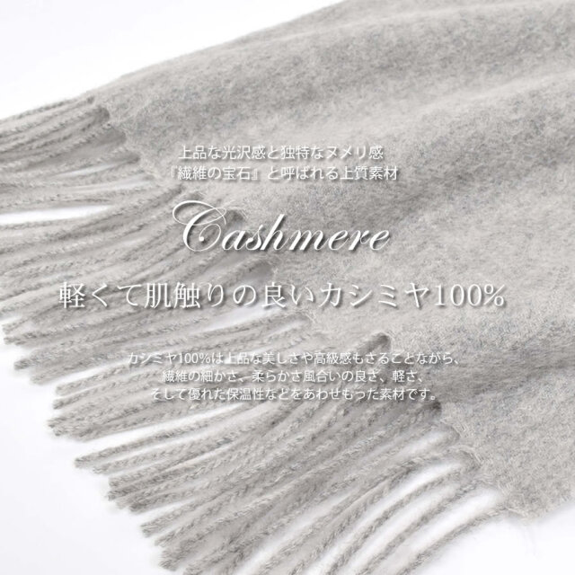 するりと滑らかな肌触りの内モンゴル産のカシミヤを100%使用。繊維の細さ・光沢・しなやかさは世界最高品質とされています。驚くほど軽く、柔らかな質感が魅力のカシミヤ100%マフラー。さっと巻くだけで優しく包み込まれる贅沢。ふんわりと暖かく、いろんなアレンジで冬中活躍してくれるアイテムです。また、長さがあるので男女兼用でお使いいただけます。