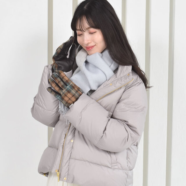 Wフェイスでふっくら厚みのあるカシミヤブレンドマフラー。ウール90%とカシミヤ10%を配合したブレンド生地で柔らかい肌触りと厚みのある温かなカシミア混のマフラー。保温に優れた軽量な素材は、チェック柄×無地と無地のバイカラーの2種類でリバーシブル仕様。