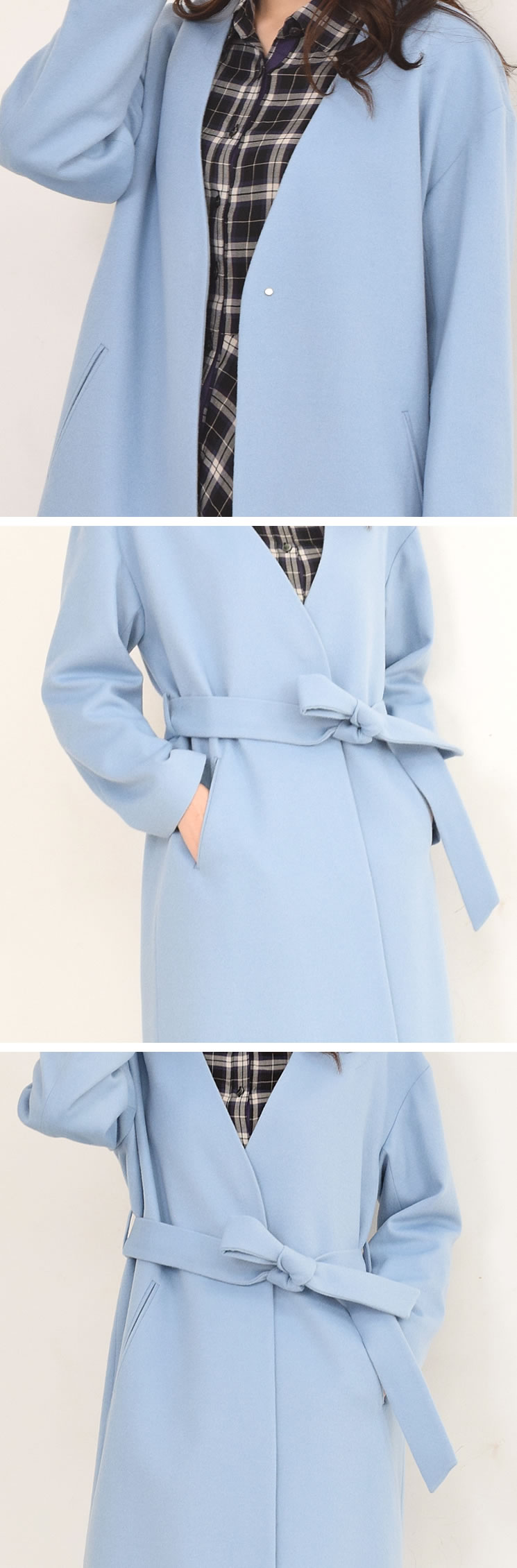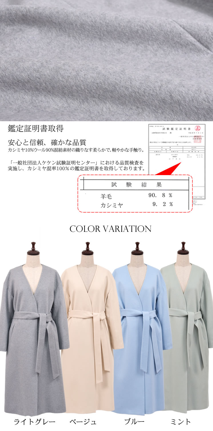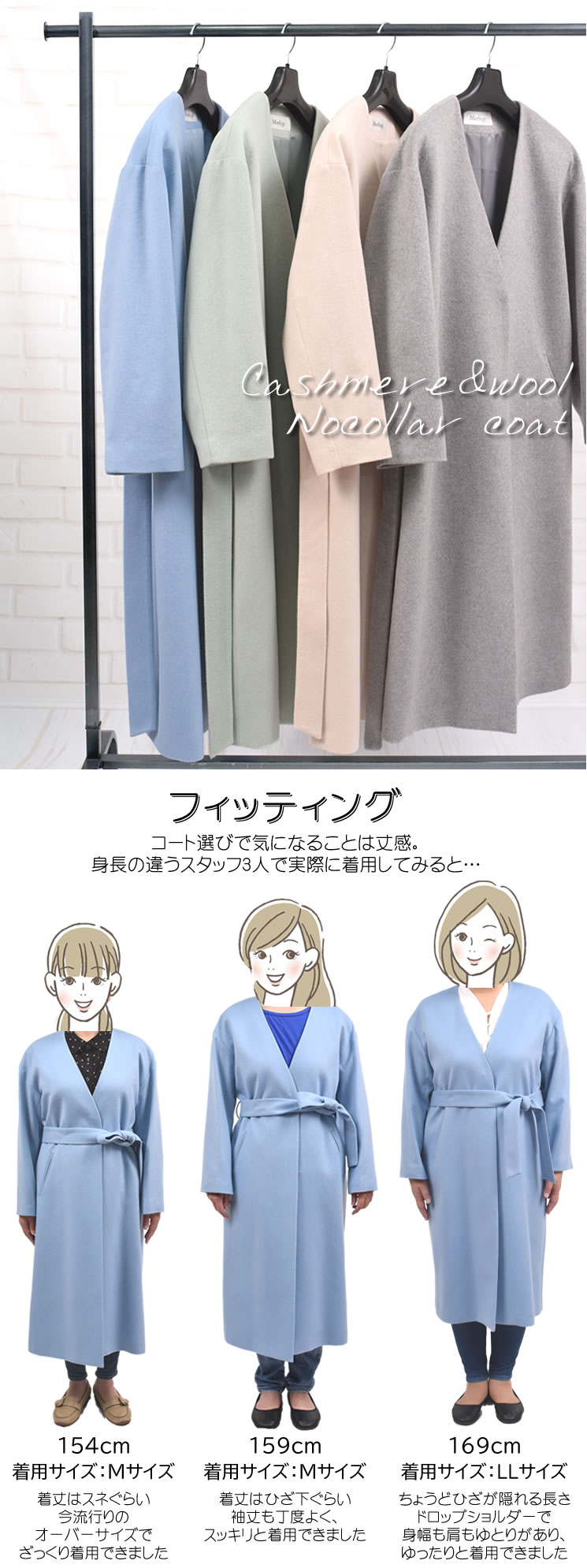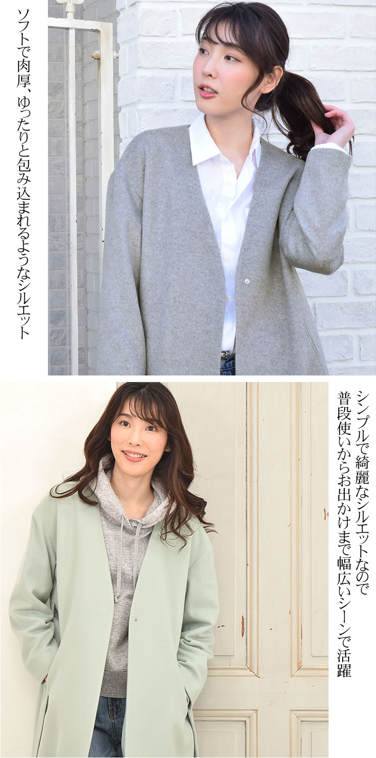 カシミヤ混紡のソフトでゆったりとしたシルエットのノーカラーコート。ドロップショルダーなのでニットの上から着てもごわつきにくい。スッキリとした首周りのデザインでインナーにパーカーやタートルを着たり、ストールを巻いても◎。ベルトでウエストマークすれば、ボディラインがすっきり。シンプルで綺麗なシルエットなので普段使いからお出かけまで幅広いシーンで活躍してくれます。