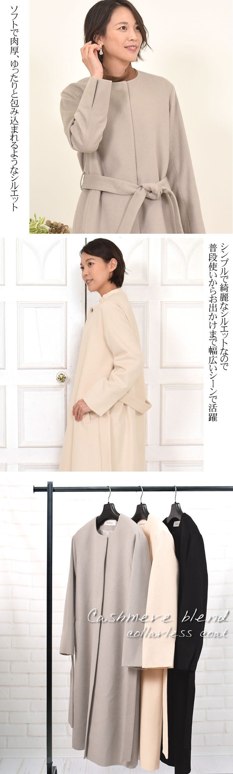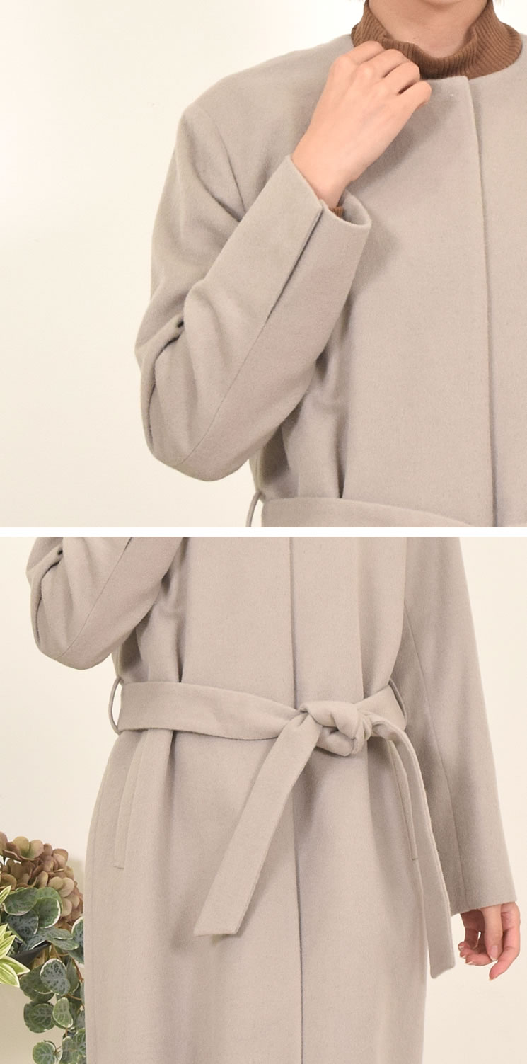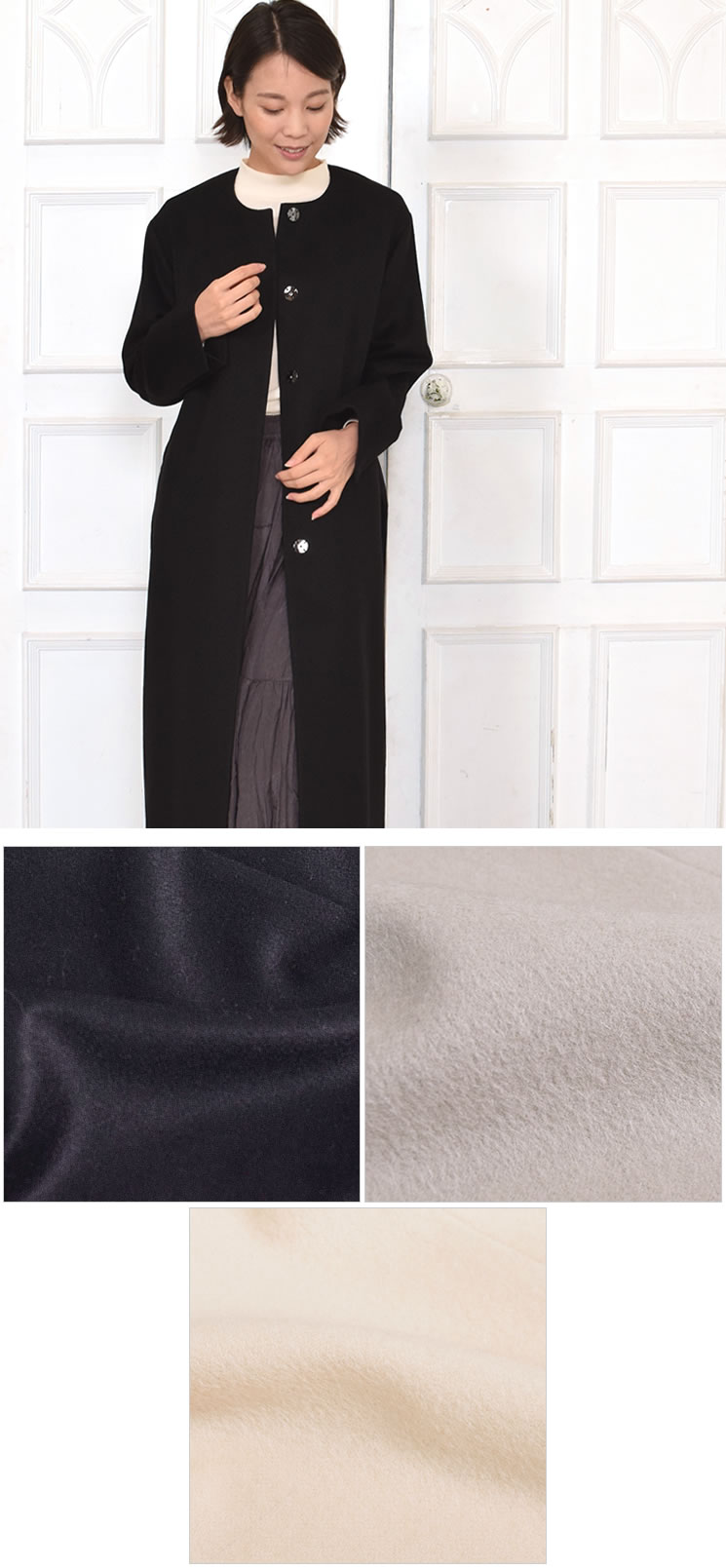 カシミヤ混ウール特有のしなやかで美しい艶ややかな素材を使用したコートです。ドロップショルダーのノーカラーデザインは、見た目はスッキリながら腕や肩の可動域が広く、ウエスとベルトでスタイリングの幅が広がります。ゆったりとしたサイズ感と長めのレングスでエレガントに着こなせる一着です。