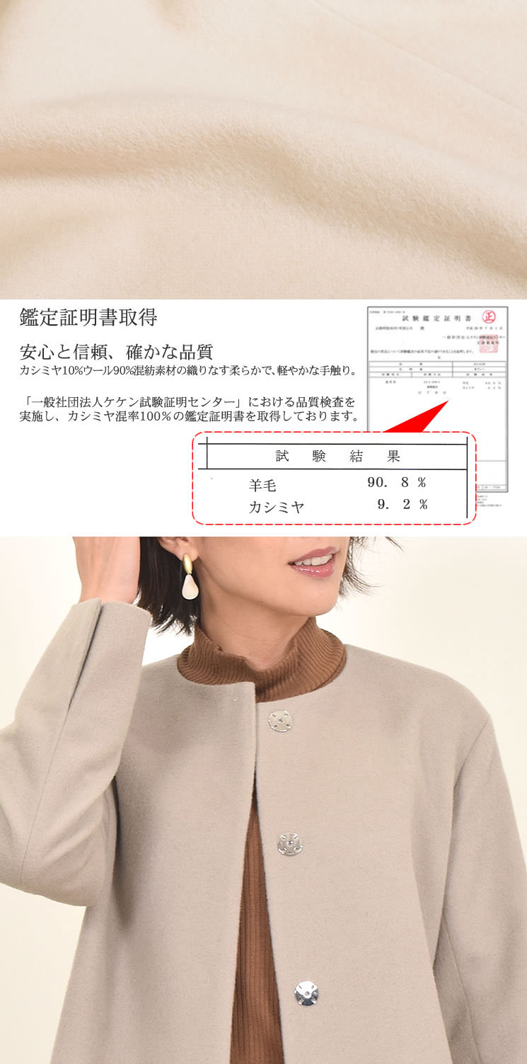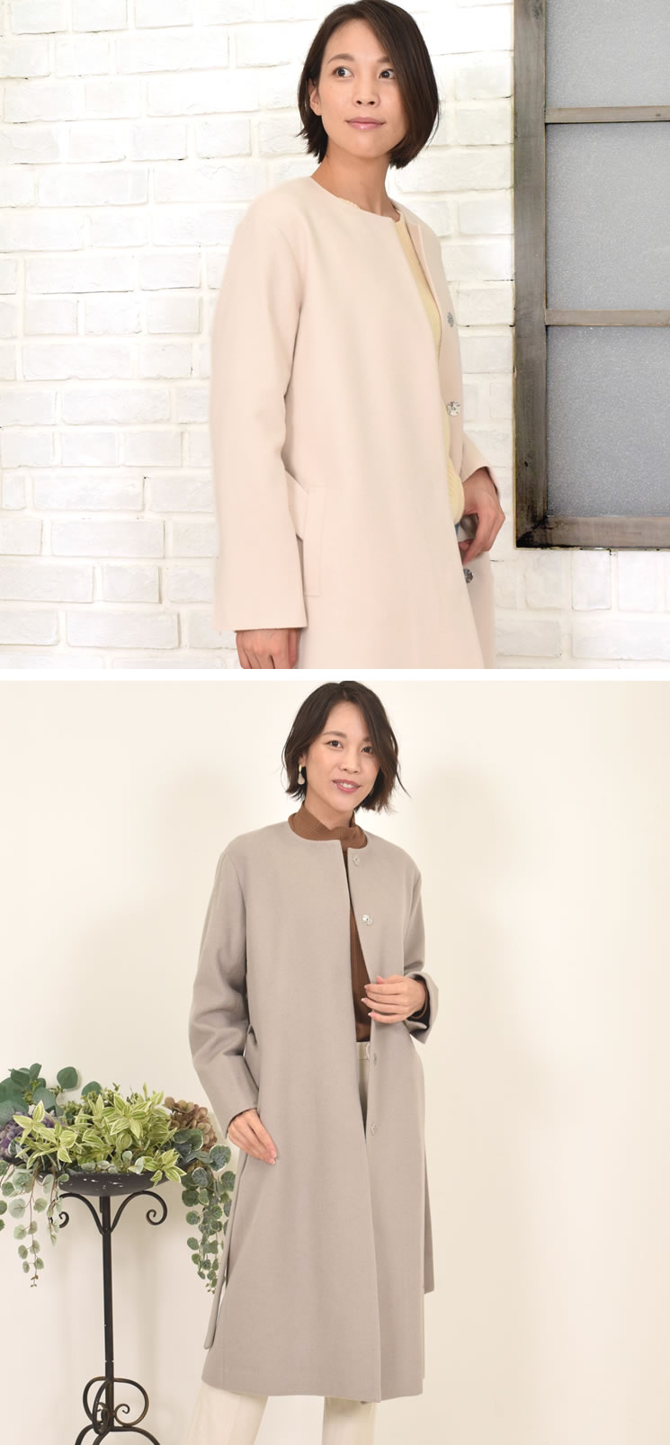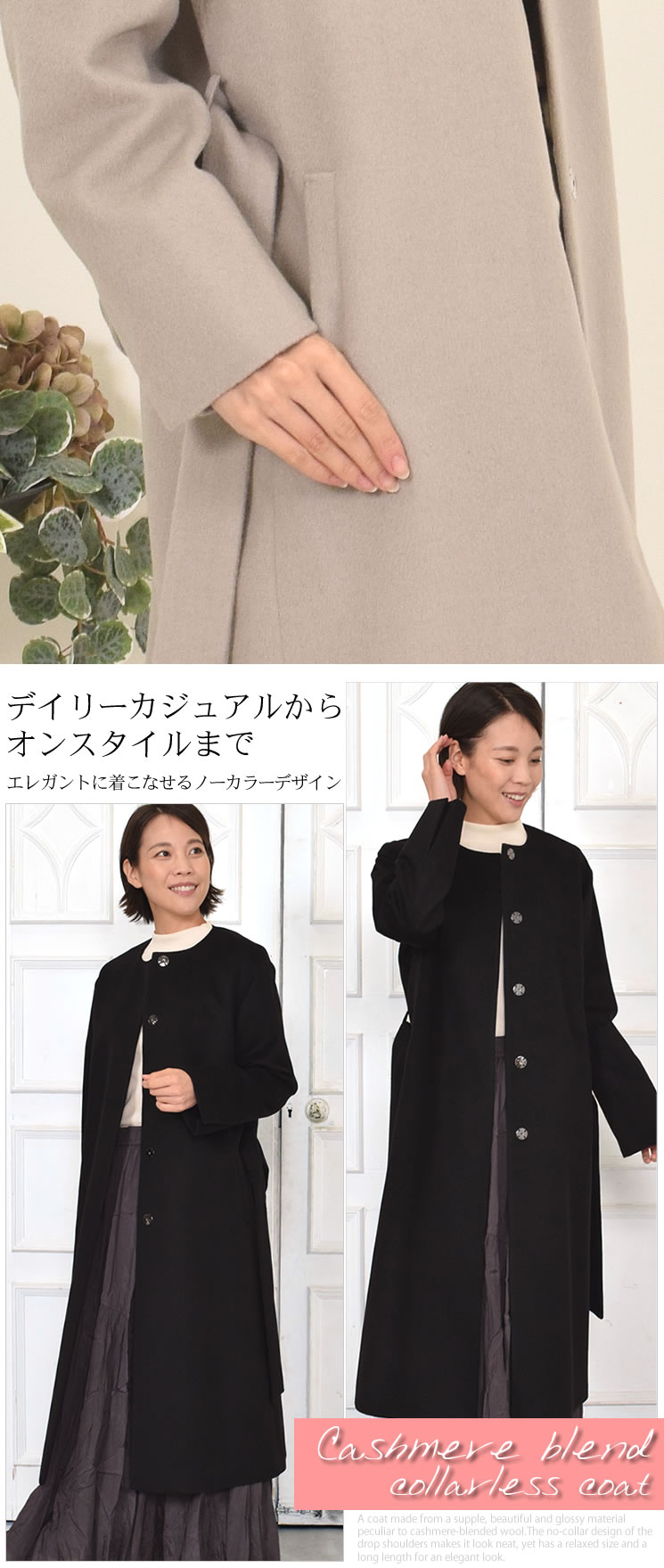 カシミヤ混ウール特有のしなやかで美しい艶ややかな素材を使用したコートです。ドロップショルダーのノーカラーデザインは、見た目はスッキリながら腕や肩の可動域が広く、ウエスとベルトでスタイリングの幅が広がります。ゆったりとしたサイズ感と長めのレングスでエレガントに着こなせる一着です。