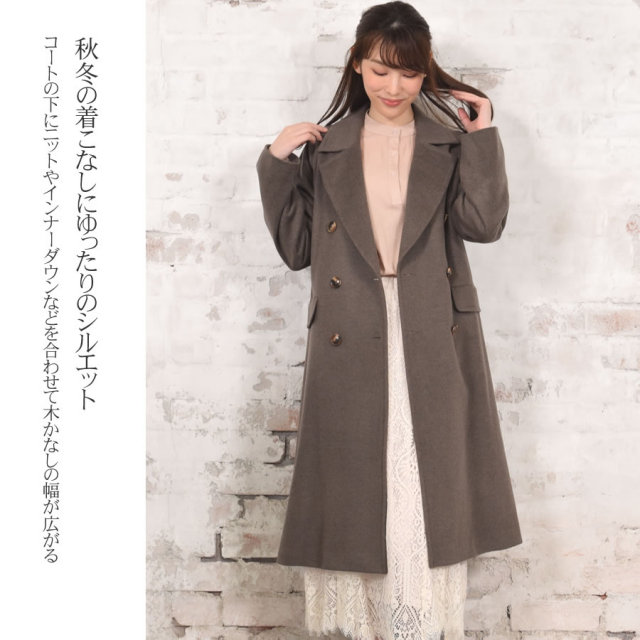 ボックスシルエットが旬なダブルチェスターコートです。カシミヤ10%ウール90%混紡素材の織りなす生地は、柔らかく軽やか。肌触りが良く、ソフトな着心地で高級感があります。ラグランスリーブを採用し、大人っぽいシックなデザイン。存在感のある大きめの襟が首元をスッキリと女性らしく見せ、小顔効果も◎。スカート裾をチラ見せできる上品な膝下丈でオフィスコーデにも最適です。シンプルなデザインのため、オン・オフ問わず着まわせる汎用性の高いアイテムです。