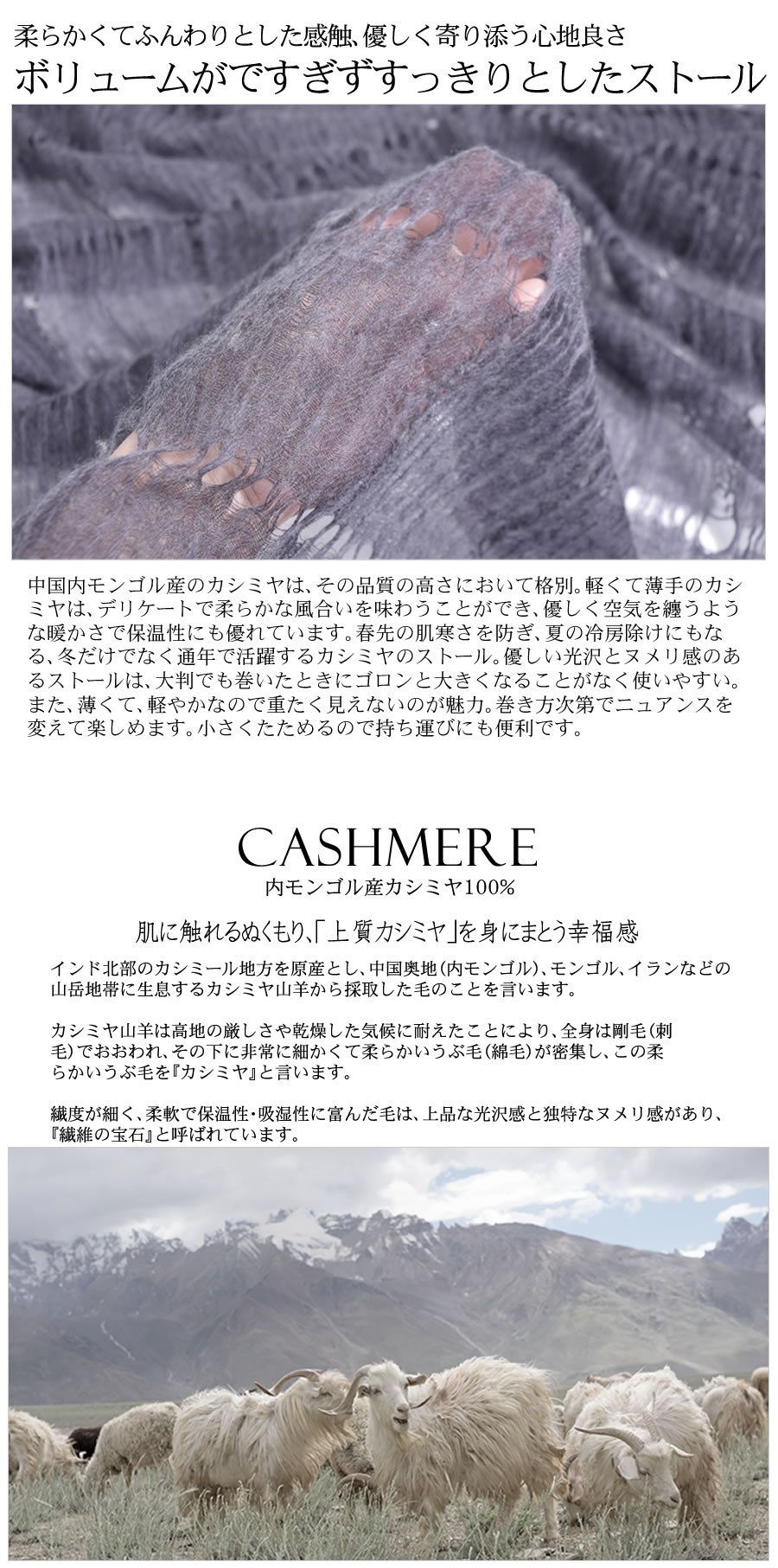中国内モンゴル産のカシミヤは、その品質の高さにおいて格別。軽くて薄手のカシミヤは、デリケートで柔らかな風合いを味わうことができ、優しく空気を纏うような暖かさで保温性にも優れています。春先の肌寒さを防ぎ、夏の冷房除けにもなる、冬だけでなく通年で活躍するカシミヤのストール。優しい光沢とヌメリ感のあるストールは、大判でも巻いたときにゴロンと大きくなることがなく使いやすい。また、薄くて、軽やかなので重たく見えないのが魅力。巻き方次第でニュアンスを変えて楽しめます。小さくたためるので持ち運びにも便利です。