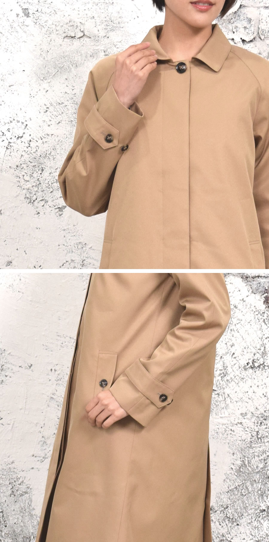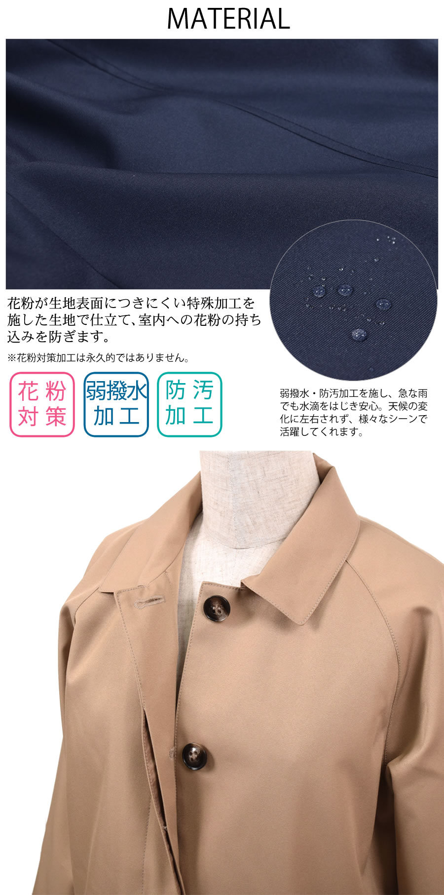 きちんと感のあるベーシックな大人のステンカラー。シンプルなデザインで着回しの利く、スタイルを良く見せてくれるきれいなシルエットです。花粉が生地表面につきにくい特殊加工を施した生地で仕立て、室内への花粉の持ち込みを防ぎ、弱撥水・防汚加工で急な雨でも水滴をはじいてくれるので安心。ボタンで取り外しできる蓄熱ライナー付きで秋から冬、そして春先までロングシーズン活躍してくれるアウターです。