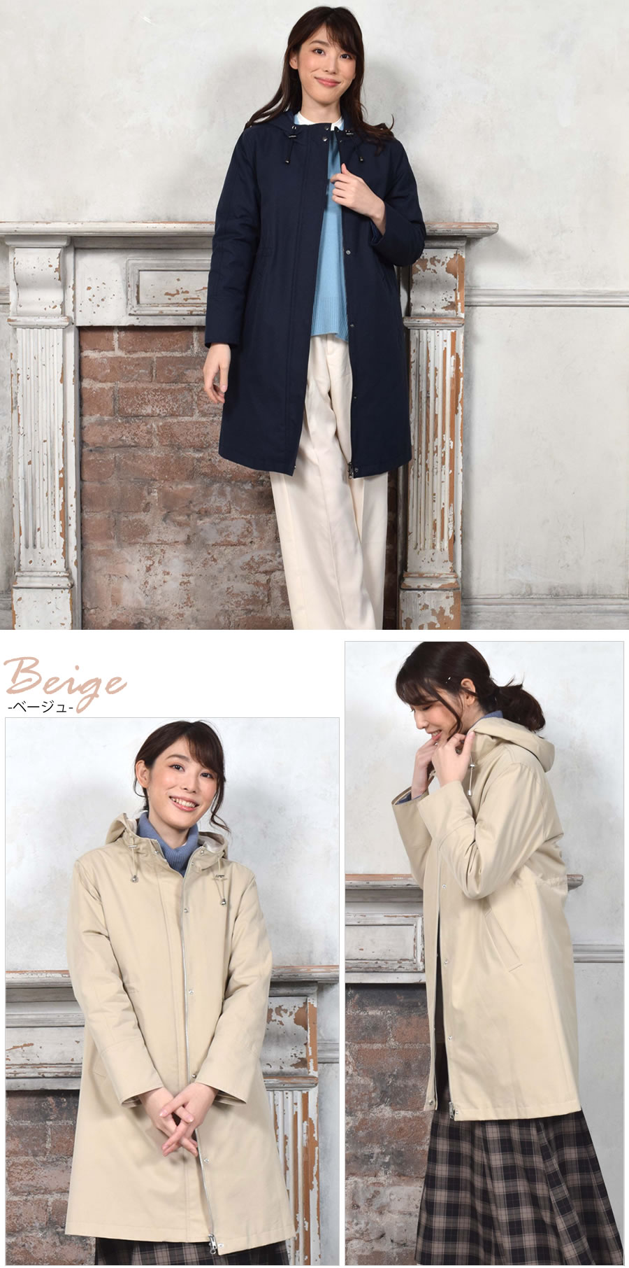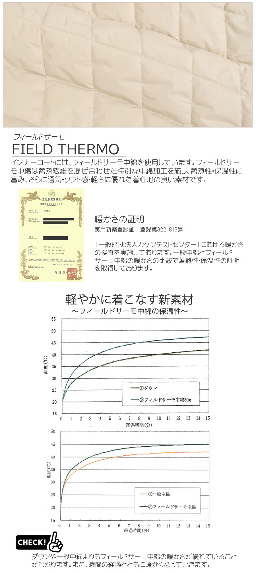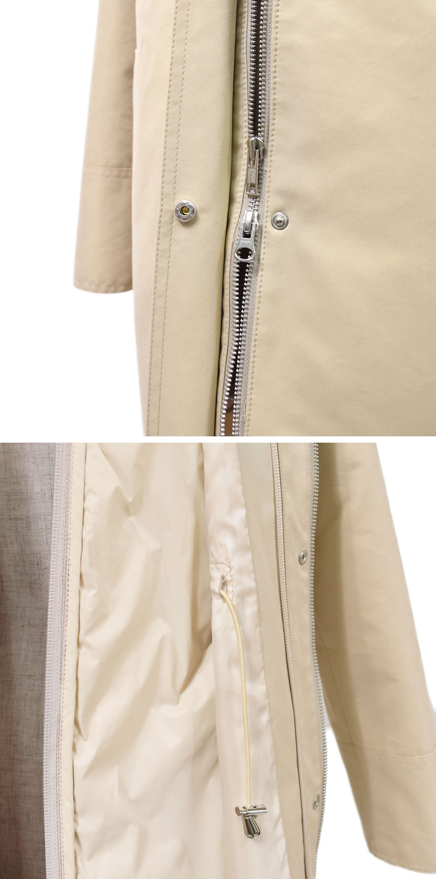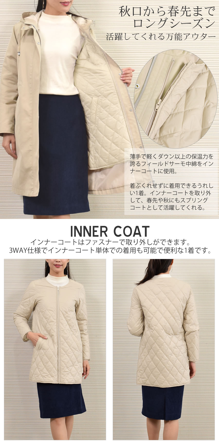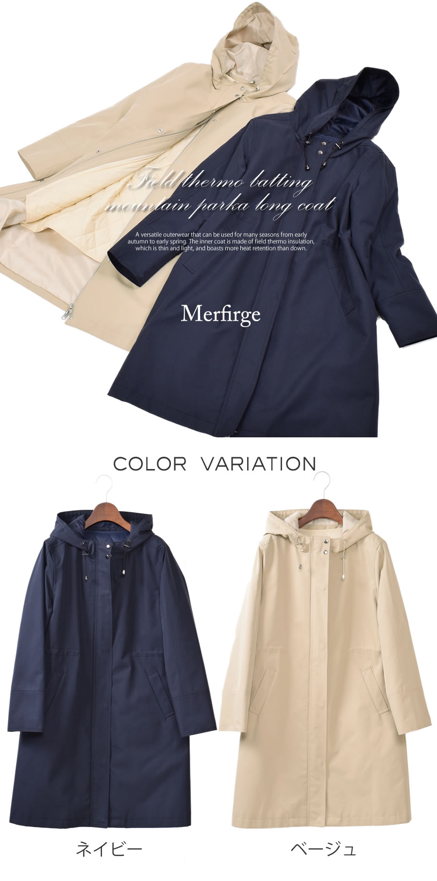 薄手でダウン以上の保温力のロングマウンテンパーカー。トレンドであるマウンテンパーカーに長いシーズン着ていただけるように、取り外しが可能なインナーコートをつけました。秋から初冬はインナーを外して一枚で、寒さが増すころにはインナーをつけて。もちろんインナーコート一枚でも着用でき、3通りの着こなしが楽しめます。ウエストラインをドロストすれば、シルエットにアクセントがつき、首元から立体的に立ち上がるフードで暖かさもUP。インナーコートには「フィールドサーモ中綿」を使用し、蓄熱性・通気性・ソフト感・軽さに優れ、着心地良く仕上げています。